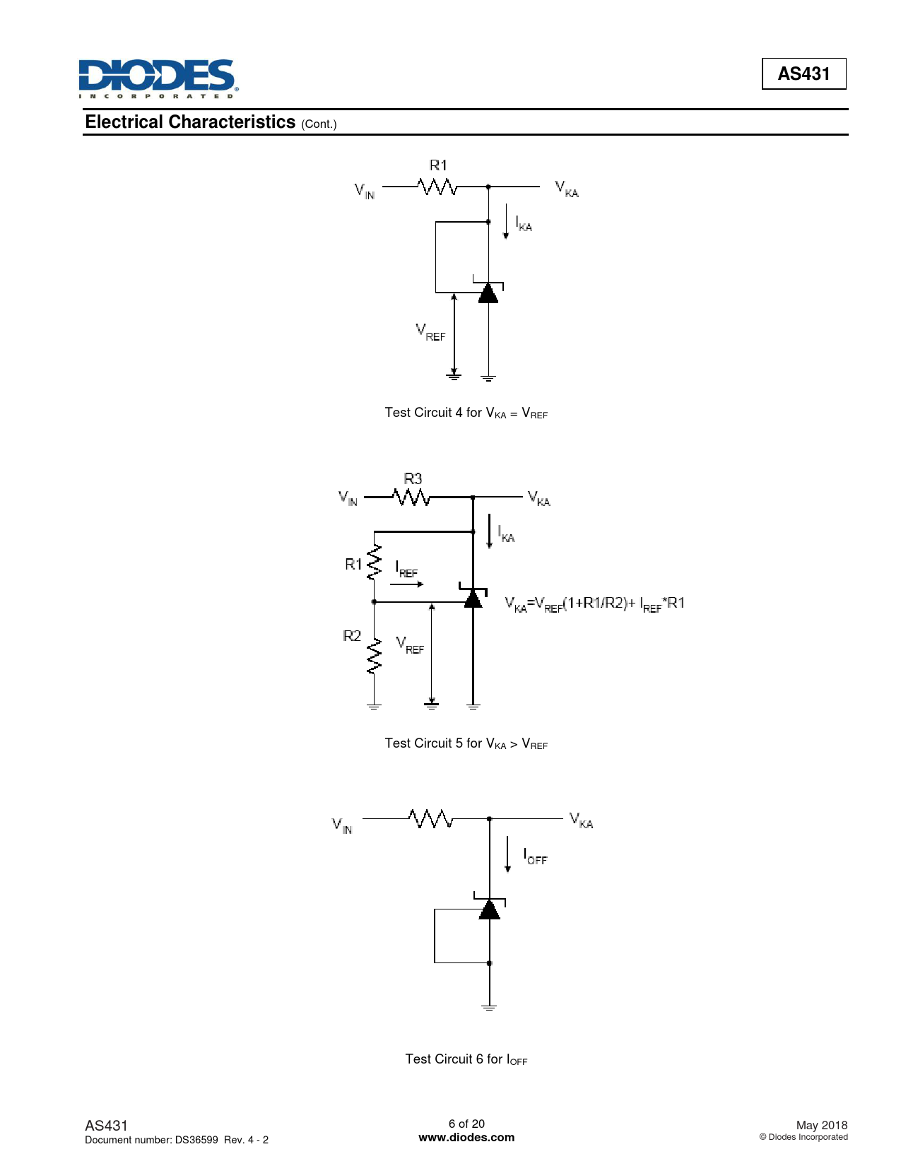 (Cont.) Test Circuit 4 for VKA = VREF Test Circuit 5 for VKA > VREF Test Circuit 6 for IOFF AS431 6 of 20 May 2018 Document number: DS36599 Rev. 4 - 2