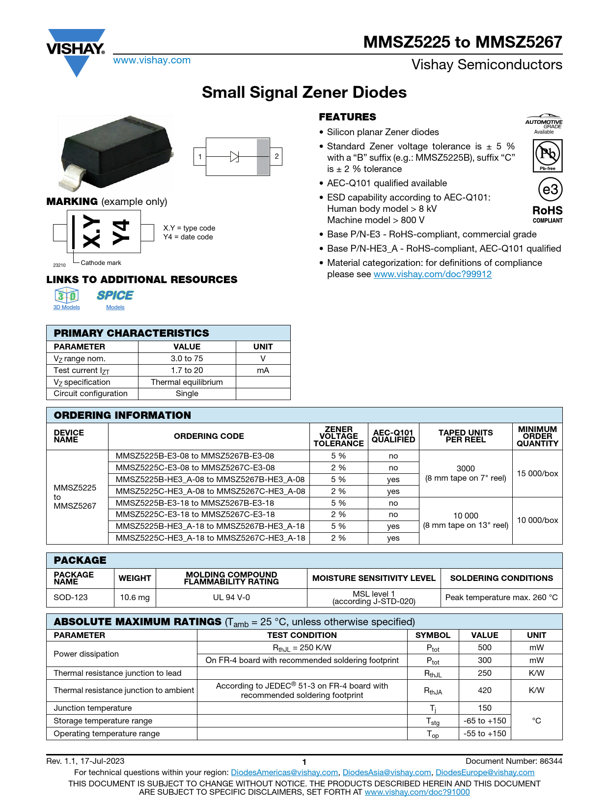 MMSZ5225 to MMSZ5267 www.vishay.com Vishay Semiconductors Small Signal Zener DiodesFEATURES • Silicon planar Zener diodes Available • Standard Zener voltage tolerance is ± 5 % 1 2 with a “B” suffix (e.g.: MMSZ5225B), suffix “C” is ± 2 % tolerance • AEC-Q101 qualified available MARKING (example only) • ESD capability according to AEC-Q101: Human body model > 8 kV Machine model > 800 V X.Y = type code • Base P/N-E3 - RoHS-compliant, commercial grade X.YY4 Y4 = date code • Base P/N-HE3_A - RoHS-compliant, AEC-Q101 qualified Cathode mark 23210 • Material categorization: for definitions of compliance LINKS TO ADDITIONAL RESOURCES please see www.vishay.com/doc?99912 D 33 D3D ModelsModelsPRIMARY CHARACTERISTICS PARAMETERVALUEUNIT VZ range nom. 3.0 to 75 V Test current IZT 1.7 to 20 mA VZ specification Thermal equilibrium Circuit configuration Single ORDERING INFORMATIONDEVICEZENERAEC-Q101TAPED UNITSMINIMUMNAMEORDERING CODEVOLTAGEORDERTOLERANCEQUALIFIEDPER REELQUANTITY MMSZ5225B-E3-08 to MMSZ5267B-E3-08 5 % no MMSZ5225C-E3-08 to MMSZ5267C-E3-08 2 % no 3000 15 000/box MMSZ5225B-HE3_A-08 to MMSZ5267B-HE3_A-08 5 % yes (8 mm tape on 7" reel) MMSZ5225 MMSZ5225C-HE3_A-08 to MMSZ5267C-HE3_A-08 2 % yes to MMSZ5267 MMSZ5225B-E3-18 to MMSZ5267B-E3-18 5 % no MMSZ5225C-E3-18 to MMSZ5267C-E3-18 2 % no 10 000 10 000/box MMSZ5225B-HE3_A-18 to MMSZ5267B-HE3_A-18 5 % yes (8 mm tape on 13" reel) MMSZ5225C-HE3_A-18 to MMSZ5267C-HE3_A-18 2 % yes PACKAGE PACKAGENAMEWEIGHTMOLDING COMPOUNDFLAMMABILITY RATINGMOISTURE SENSITIVITY LEVELSOLDERING CONDITIONS SOD-123 10.6 mg UL 94 V-0 MSL level 1 (according J-STD-020) Peak temperature max. 260 °C ABSOLUTE MAXIMUM RATINGS (Tamb = 25 °C, unless otherwise specified) PARAMETERTEST CONDITIONSYMBOLVALUEUNIT RthJL = 250 K/W Ptot 500 mW Power dissipation On FR-4 board with recommended soldering footprint Ptot 300 mW Thermal resistance junction to lead RthJL 250 K/W According to JEDEC® 51-3 on FR-4 board with Thermal resistance junction to ambient R recommended soldering footprint thJA 420 K/W Junction temperature Tj 150 Storage temperature range Tstg -65 to +150 °C Operating temperature range Top -55 to +150 Rev. 1.1, 17-Jul-2023 1 Document Number: 86344 For technical questions within your region: DiodesAmericas@vishay.com, DiodesAsia@vishay.com, DiodesEurope@vishay.com THIS DOCUMENT IS SUBJECT TO CHANGE WITHOUT NOTICE. THE PRODUCTS DESCRIBED HEREIN AND THIS DOCUMENT ARE SUBJECT TO SPECIFIC DISCLAIMERS, SET FORTH AT www.vishay.com/doc?91000