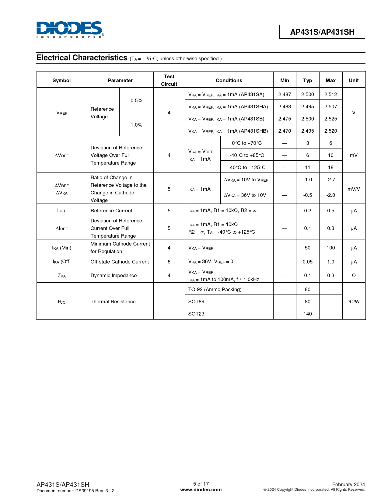 AP431S/AP431SH. Electrical Characteristics. Test. Symbol. Parameter. Conditions. Min. Typ. Max. Unit. Circuit. www.diodes.com