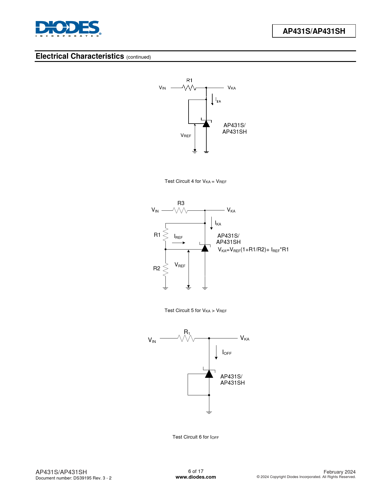 (continued) VIN VKA AP431S/ AP431SH VREF Test Circuit 4 for VKA = VREF R3 VIN VKA IKA R1 I AP431S/ REF AP431I AP431SH VKA=VREF(1+R1/R2)+ IREF*R1 VREF R2 Test Circuit 5 for VKA > VREF R1 V VKA IN IOFF AP431I AP431S/ AP431SH Test Circuit 6 for IOFF AP431S/AP431SH 6 of 17 February 2024 Document number: DS39195 Rev. 3 - 2