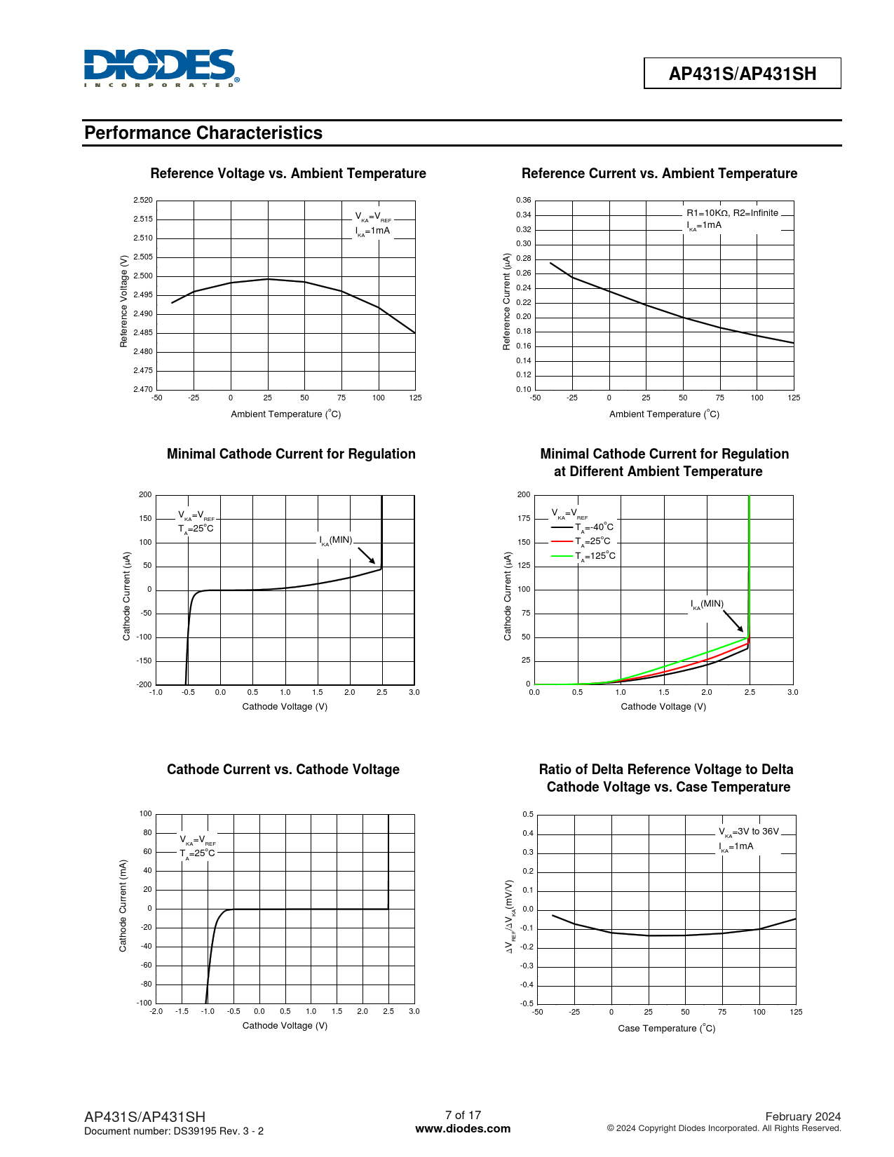 100 0.5 80 0.4 V =3V to 36V V =V KA KA REF I =1mA 60 KA T =25oC 0.3 A A) m 40 0.2 t ( n V) 20 0.1 rre u (mV/ C 0 0.0 e KA d o -20 /V -0.1 F th a RE C -40 -0.2 V -60 -0.3 -80 -0.4 -100 -0.5 -2.0 -1.5 -1.0 -0.5 0.0 0.5 1.0 1.5 2.0 2.5 3.0 -50 -25 0 25 50 75 100 125 Cathode Voltage (V) Case Temperature (oC) AP431S/AP431SH 7 of 17 February 2024 Document number: DS39195 Rev. 3 - 2