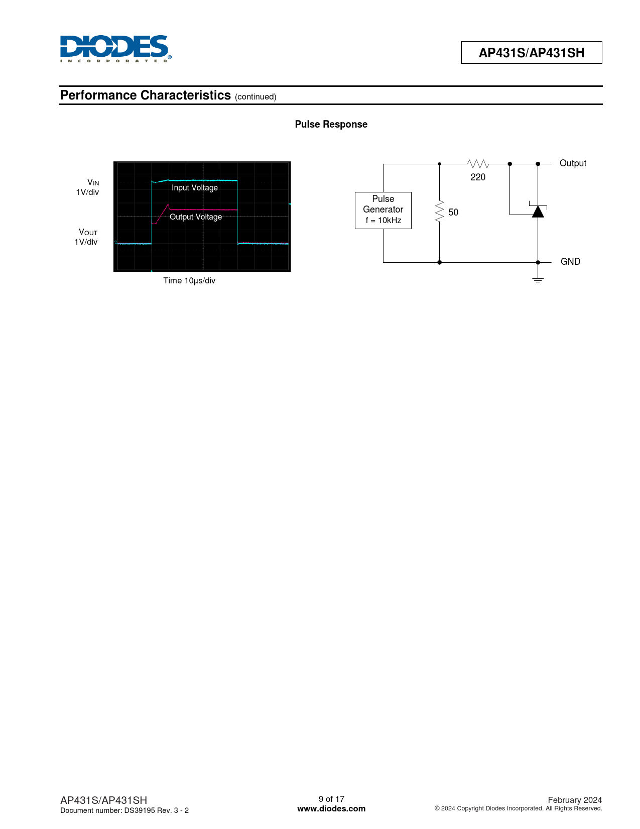 Output 220 VIN Input Voltage 1V/div Pulse Generator 50 Output Voltage f= 10 = 1 KHz 0kHz VOUT 1V/div GND Time 10µs/div AP431S/AP431SH 9 of 17 February 2024 Document number: DS39195 Rev. 3 - 2