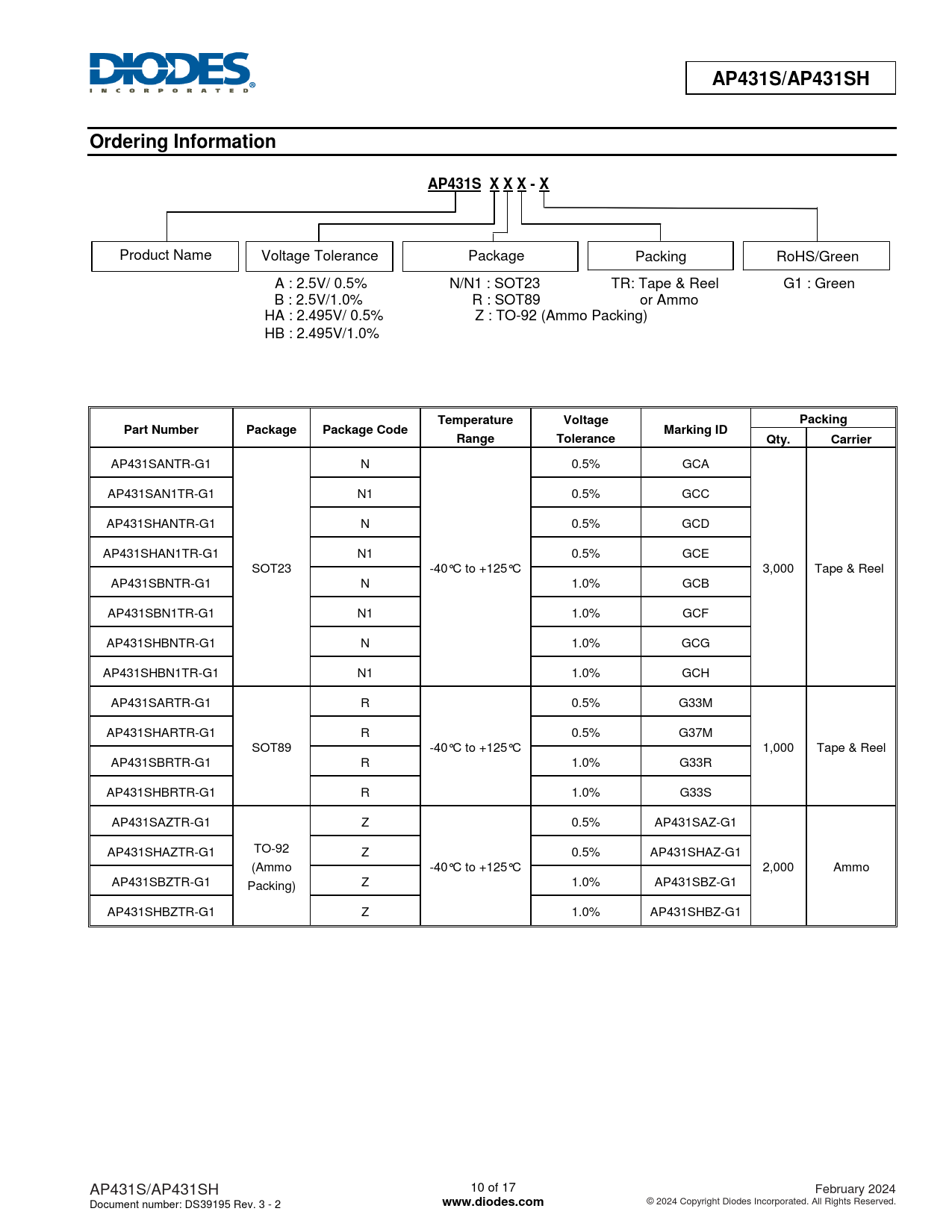 C 2,000 Ammo AP431SBZTR-G1 Packing) Z 1.0% AP431SBZ-G1 AP431SHBZTR-G1 Z 1.0% AP431SHBZ-G1 AP431S/AP431SH 10 of 17 February 2024 Document number: DS39195 Rev. 3 - 2