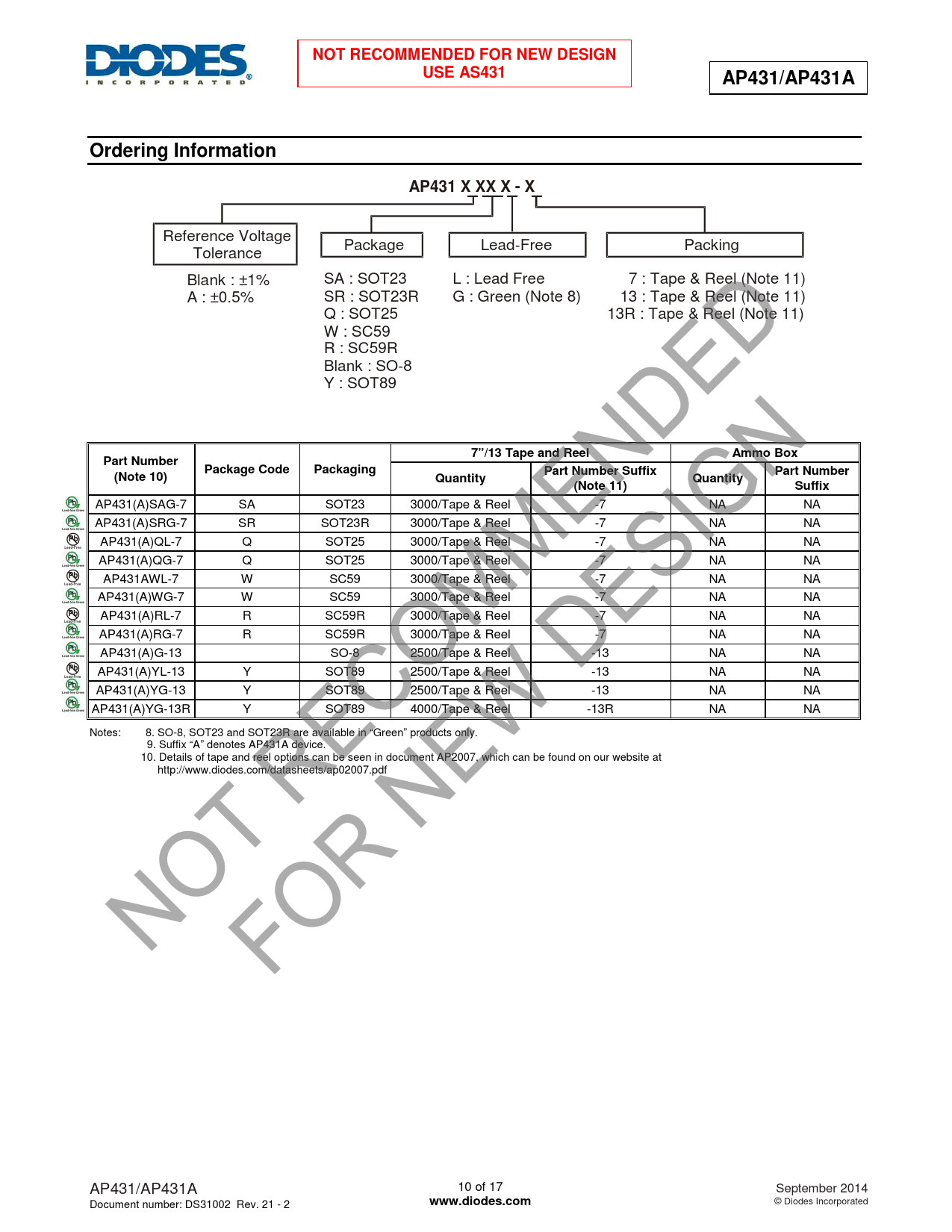 NOT RECOMMENDED FOR NEW DESIGN. USE AS431. AP431/AP431A. Ordering Information. AP431 X XX X - X. 7”/13 Tape and Reel. Ammo Box
