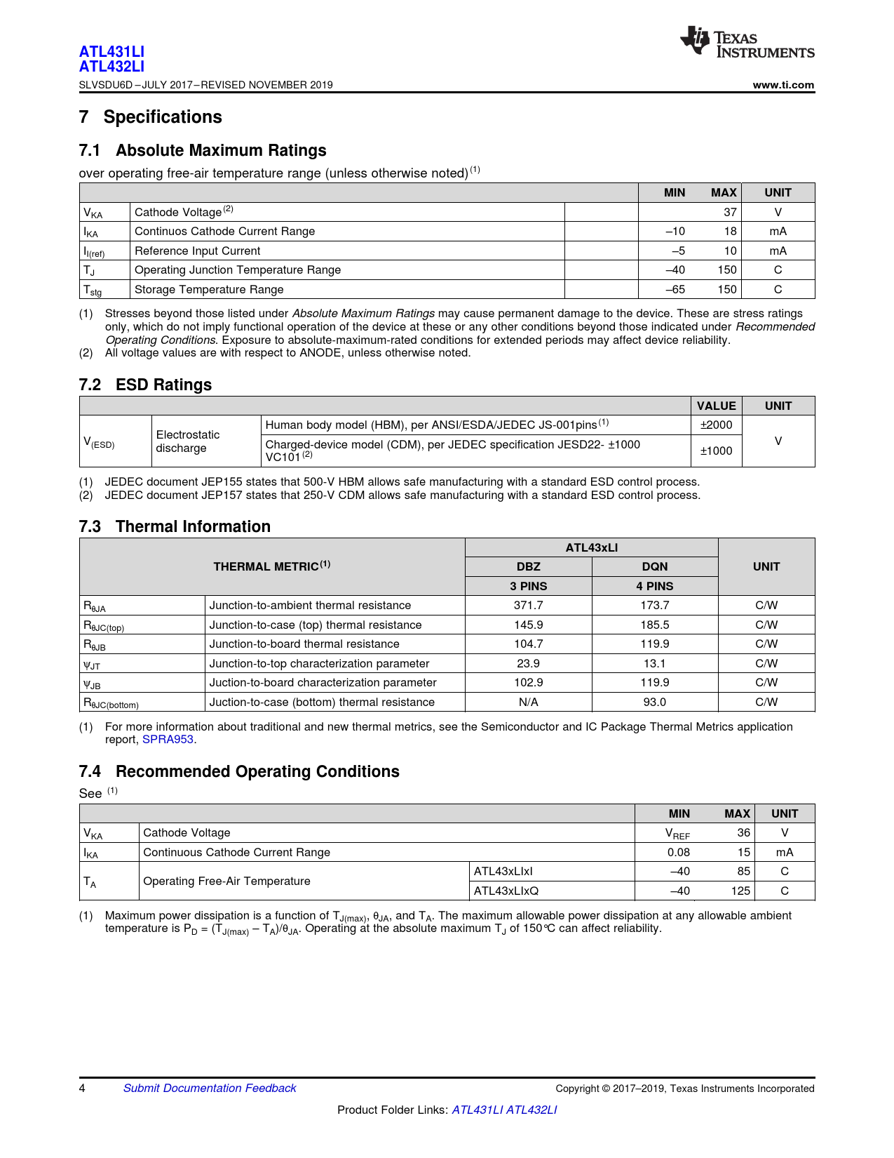 ATL431LI. ATL432LI. www.ti.com. 7 Specifications. 7.1 Absolute Maximum Ratings. MIN. MAX. UNIT. 7.2 ESD Ratings. VALUE