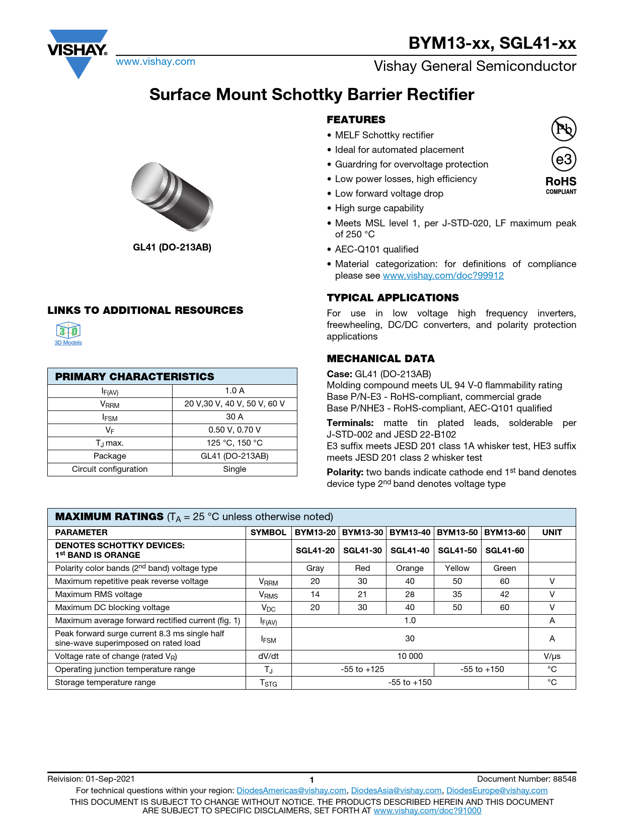 BYM13-xx, SGL41-xx www.vishay.com Vishay General Semiconductor Surface Mount Schottky Barrier Rectifier