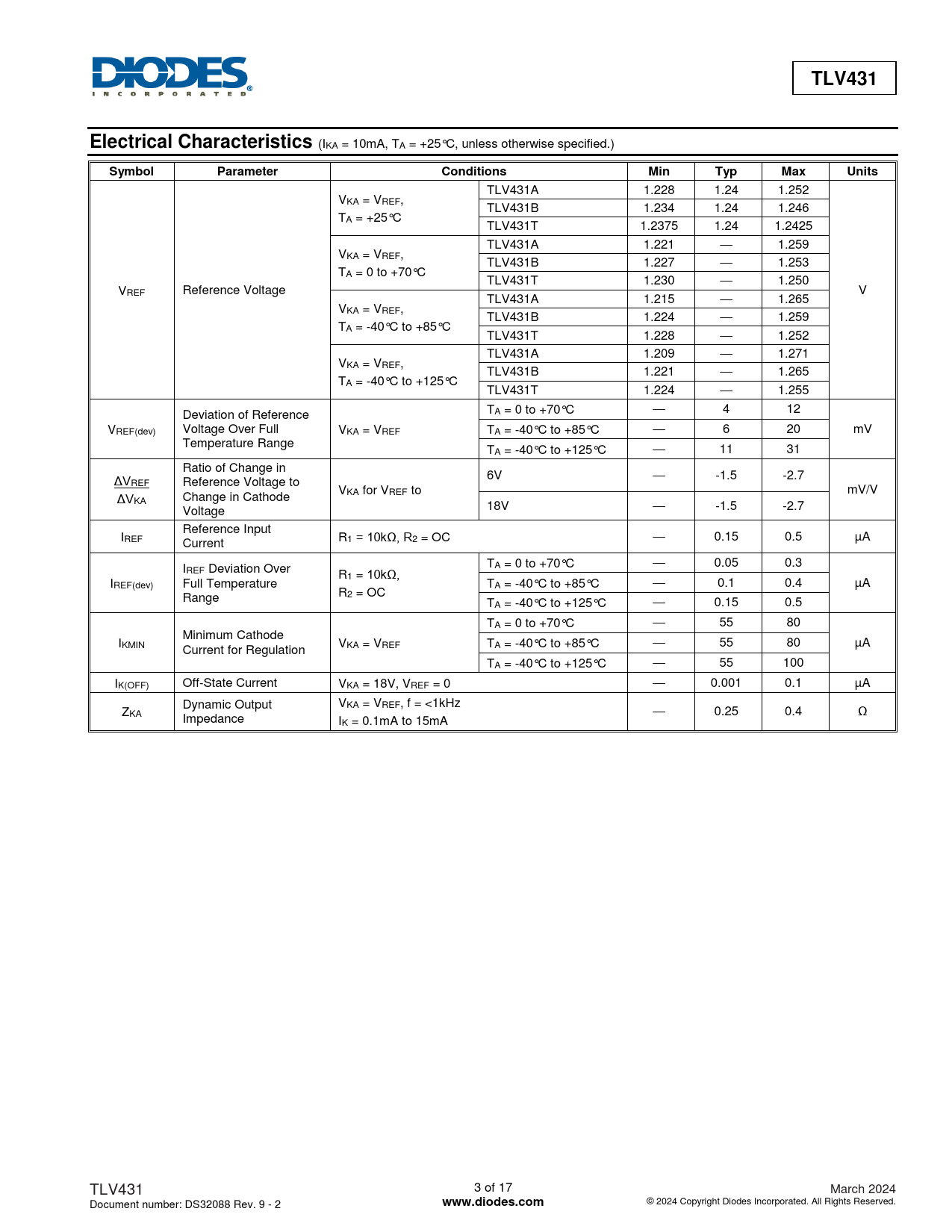 TLV431. Electrical Characteristics. Symbol. Parameter. Conditions. Min. Typ. Max. Units. www.diodes.com