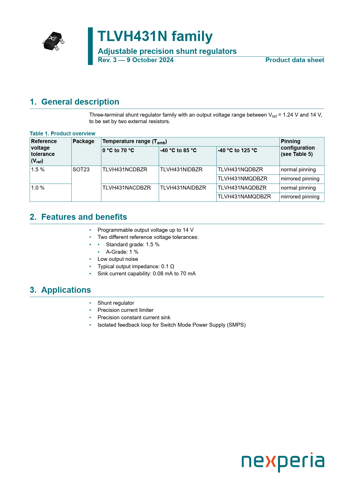 TLVH431N family Adjustable precision shunt regulators Rev. 3 — 9 October 2024 Product data sheet 1. General description
