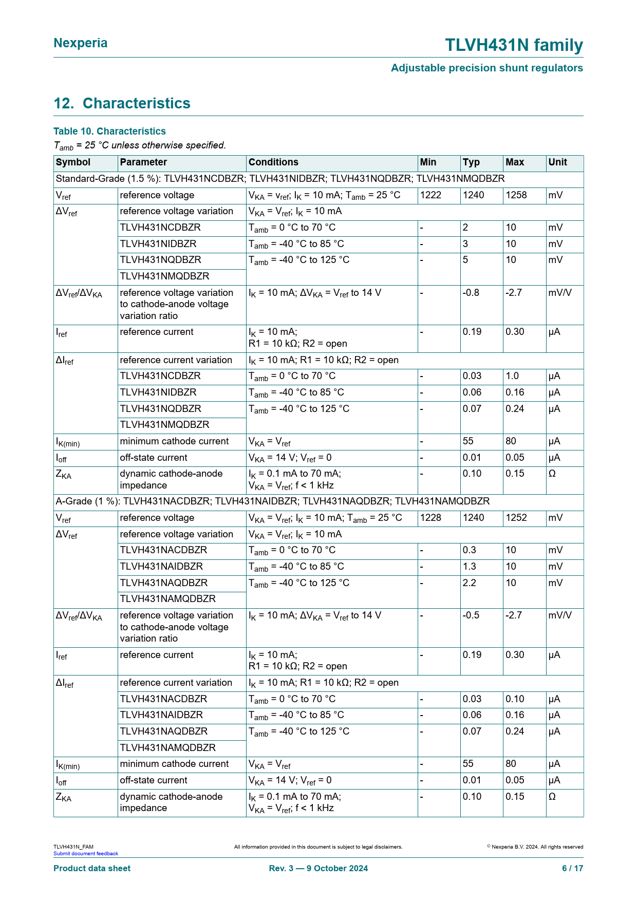 Nexperia. TLVH431N family. Adjustable precision shunt regulators. 12. Characteristics Table 10. Characteristics. Symbol