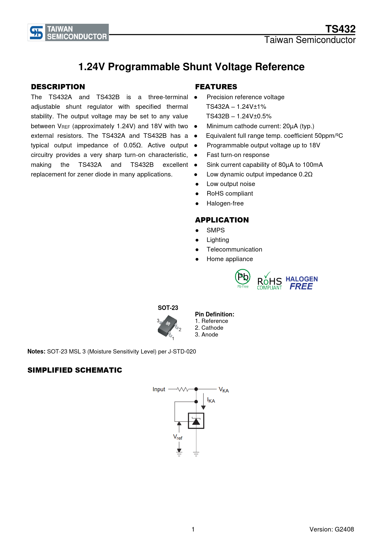 TS432. 1.24V Programmable Shunt Voltage Reference. DESCRIPTION. FEATURES. APPLICATION. SOT-23. Pin Definition:. Notes: