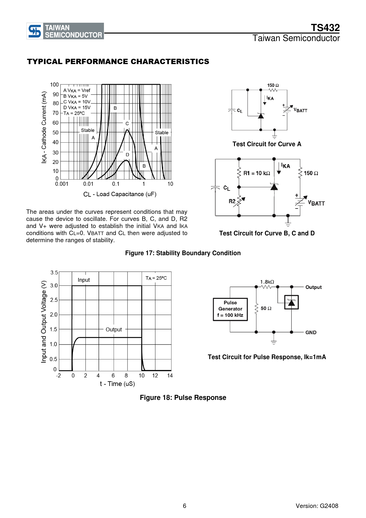 TS432 Taiwan Semiconductor TYPICAL PERFORMANCE CHARACTERISTICSTest Circuit for Curve A The areas under the curves represent conditions that may cause the device to oscillate. For curves B, C, and D, R2 and V+ were adjusted to establish the initial VKA and IKA conditions with CL=0. VBATT and CL then were adjusted to Test Circuit for Curve B, C and D determine the ranges of stability. Figure 17: Stability Boundary ConditionTest Circuit for Pulse Response, Ik=1mAFigure 18: Pulse Response 6 Version: G2408
