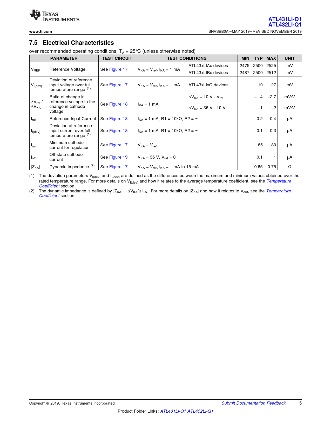 | Pages / Page | 37 / 5 — ATL431LI-Q1. ATL432LI-Q1. www.ti.com. 7.5 Electrical Characteristics. … |
