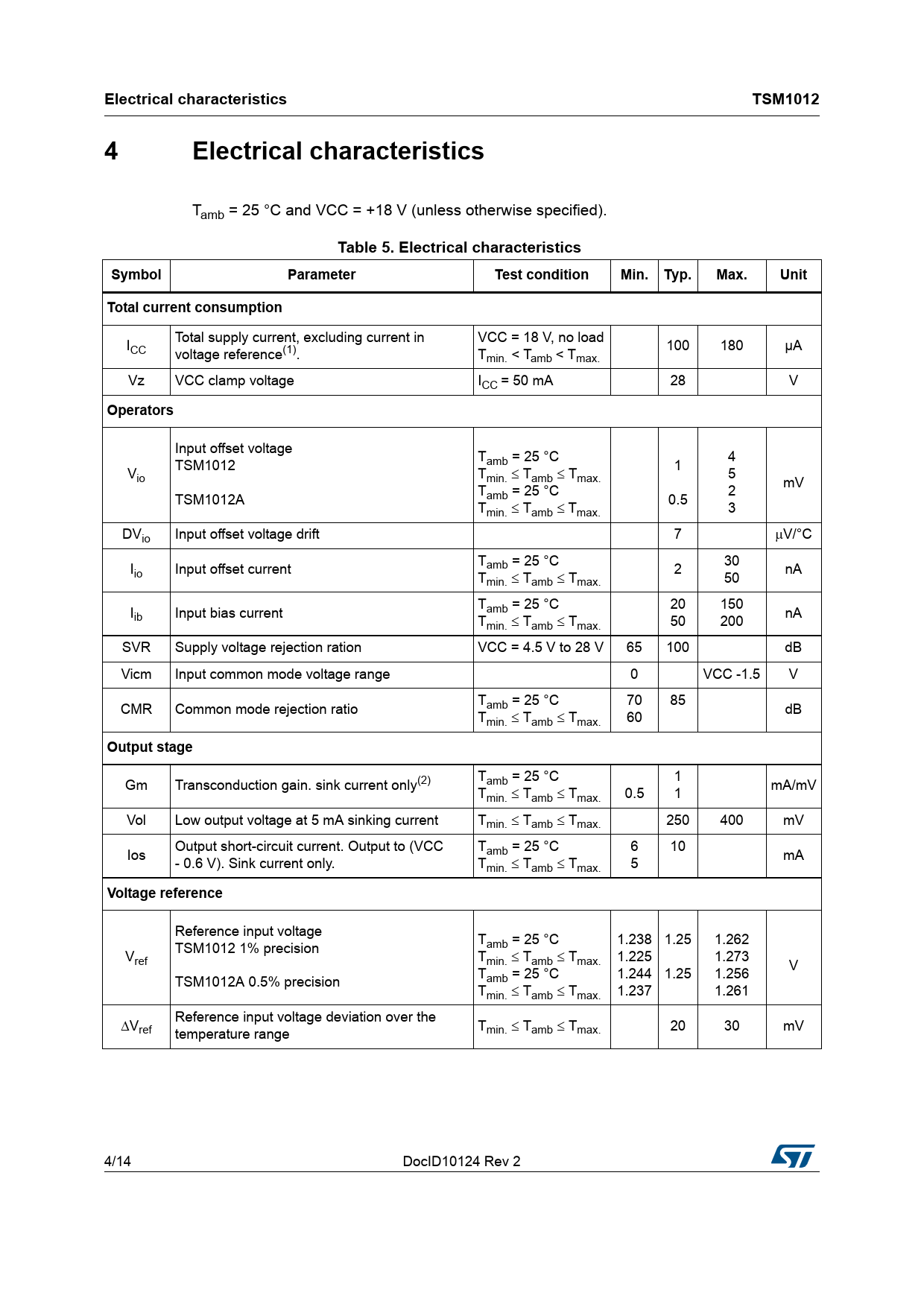 Electrical characteristicsTSM10124 Electricalcharacteristics Tamb = 25 °C and VCC = +18 V (unless otherwise specified). Table 5. Electrical characteristicsSymbolParameterTest conditionMin. Typ.Max.UnitTotal current consumption Total supply current, excluding current in VCC = 18 V, no load ICC 100 180 µA voltage reference(1). Tmin. < Tamb < Tmax. Vz VCC clamp voltage ICC = 50 mA 28 V Operators Input offset voltage T 4 TSM1012 amb = 25 °C 1 Vio Tmin. Tamb Tmax. 5 mV T 2 TSM1012A amb = 25 °C 0.5 Tmin. Tamb Tmax. 3 DVio Input offset voltage drift 7 V/°C T 30 I amb = 25 °C io Input offset current 2 nA Tmin. Tamb Tmax. 50 T 20 150 I amb = 25 °C ib Input bias current nA Tmin. Tamb Tmax. 50 200 SVR Supply voltage rejection ration VCC = 4.5 V to 28 V 65 100 dB Vicm Input common mode voltage range 0 VCC -1.5 V T 70 85 CMR Common mode rejection ratio amb = 25 °C dB Tmin. Tamb Tmax. 60 Output stage 1 Gm Transconduction gain. sink current only(2) Tamb = 25 °C mA/mV Tmin. Tamb Tmax. 0.5 1 Vol Low output voltage at 5 mA sinking current Tmin. Tamb Tmax. 250 400 mV Output short-circuit current. Output to (VCC T 6 10 Ios amb = 25 °C mA - 0.6 V). Sink current only. Tmin. Tamb Tmax. 5 Voltage reference Reference input voltage T 1.238 1.25 1.262 TSM1012 1% precision amb = 25 °C Vref Tmin. Tamb Tmax. 1.225 1.273 V T 1.244 1.25 1.256 TSM1012A 0.5% precision amb = 25 °C Tmin. Tamb Tmax. 1.237 1.261 Reference input voltage deviation over the Vref T temperature range min. Tamb Tmax. 20 30 mV 4/14 DocID10124 Rev 2 Document Outline Figure 1. Pin connections (top view) Table 1. Order codes 1 Pin descriptions Table 2. SO-8 pinout 2 Absolute maximum ratings Table 3. Absolute maximum ratings 3 Operating conditions Table 4. Operating conditions 4 Electrical characteristics Table 5. Electrical characteristics 5 Internal schematics Figure 2. Internal schematic Figure 3. Typical adapter or battery charger application using TSM1012 6 Principle of operation and application hints 6.1 Voltage and current control 6.1.1 Voltage control 6.1.2 Current control Figure 4. Output voltage versus output current 6.2 Compensation 6.3 Start-up and short-circuit conditions 6.4 Voltage clamp Figure 5. Clamp voltage Figure 6. Typical application schematic 7 Package information 7.1 SO-8 package information Figure 7. SO-8 package outline Table 6. SO-8 package mechanical data 8 Revision history Table 7. Document revision history