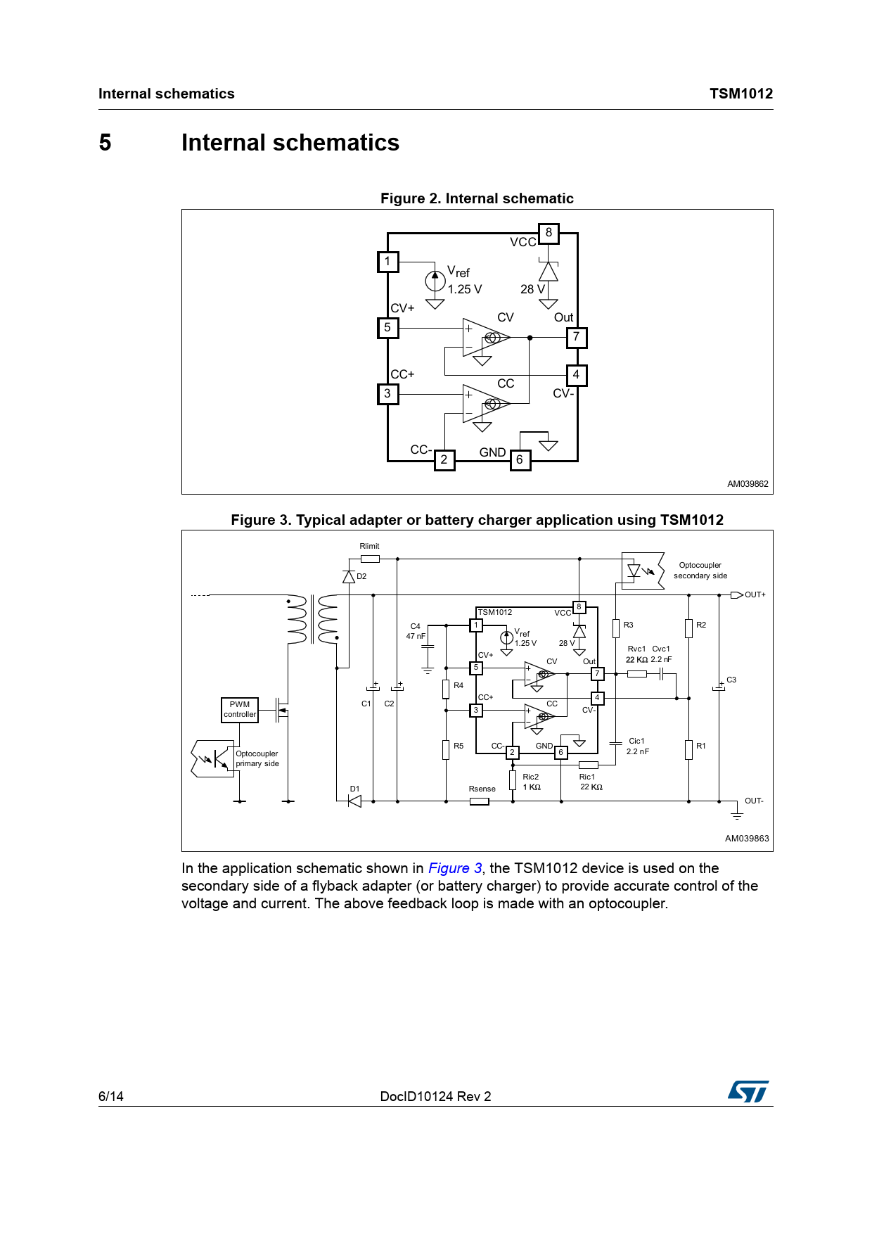 link to page 6 Internal schematicsTSM10125 InternalschematicsFigure 2. Internal schematic 7$$ 7SFG 7 7 $7 $7 0VU $$ $$ $7 $$ (/% ". Figure 3. Typical adapter or battery charger application using TSM1012 3MJNJU 0QUPDPVQMFS % TFDPOEBSZTJEF 065 54. 7$$ $ 3 3 7SFG O' 7 7 3WD $WD $7 O' $7 0VU $ 3 $$ 18. $ $ $$ $7 DPOUSPMMFS $JD 3 $$ (/% 3 O' 0QUPDPVQMFS QSJNBSZTJEF 3JD 3JD % 3TFOTF 065 ". In the application schematic shown in Figure 3, the TSM1012 device is used on the secondary side of a flyback adapter (or battery charger) to provide accurate control of the voltage and current. The above feedback loop is made with an optocoupler. 6/14 DocID10124 Rev 2 Document Outline Figure 1. Pin connections (top view) Table 1. Order codes 1 Pin descriptions Table 2. SO-8 pinout 2 Absolute maximum ratings Table 3. Absolute maximum ratings 3 Operating conditions Table 4. Operating conditions 4 Electrical characteristics Table 5. Electrical characteristics 5 Internal schematics Figure 2. Internal schematic Figure 3. Typical adapter or battery charger application using TSM1012 6 Principle of operation and application hints 6.1 Voltage and current control 6.1.1 Voltage control 6.1.2 Current control Figure 4. Output voltage versus output current 6.2 Compensation 6.3 Start-up and short-circuit conditions 6.4 Voltage clamp Figure 5. Clamp voltage Figure 6. Typical application schematic 7 Package information 7.1 SO-8 package information Figure 7. SO-8 package outline Table 6. SO-8 package mechanical data 8 Revision history Table 7. Document revision history