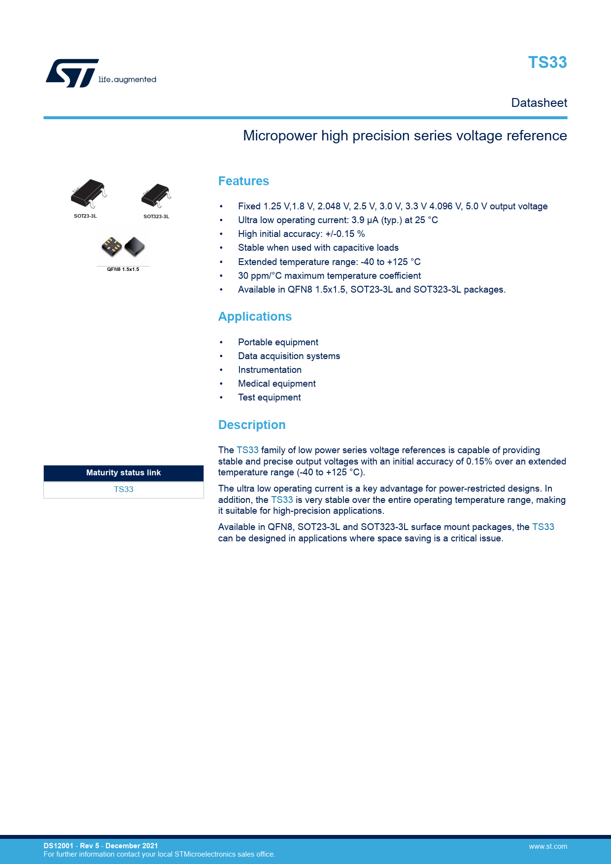 TS33. Features. SOT23-3L. SOT323-3L. QFN8 1.5x1.5. Applications. Description. Maturity status link. DS12001. Rev 5. December 2021
