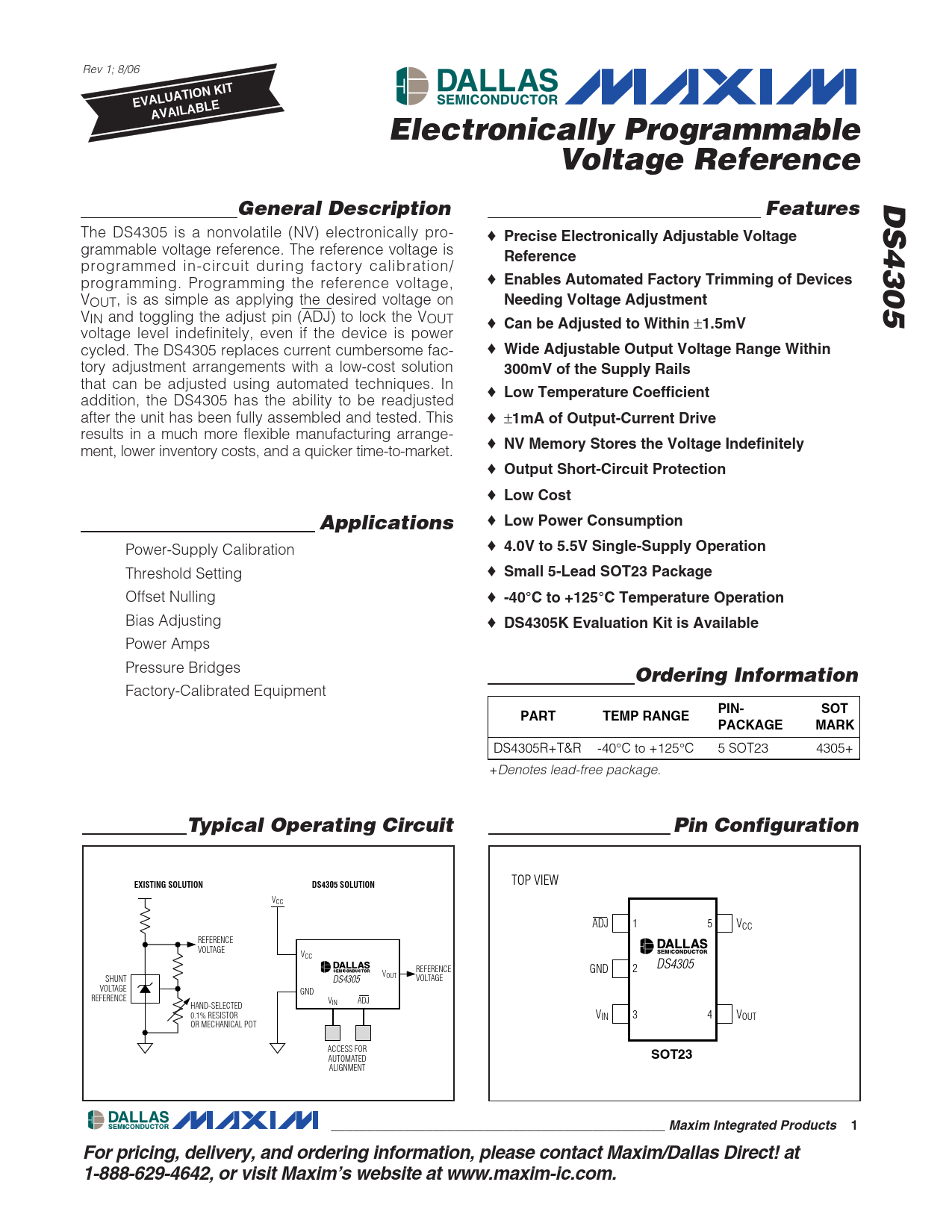 Rev 1; 8/06 EVALUATION KITAVAILABLEElectronically ProgrammableVoltage ReferenceDS4305General DescriptionFeatures The DS4305 is a nonvolatile (NV) electronically pro- ♦ Precise Electronically Adjustable Voltage grammable voltage reference. The reference voltage is Reference programmed in-circuit during factory calibration/ programming. Programming the reference voltage, ♦ Enables Automated Factory Trimming of Devices VOUT, is as simple as applying the desired voltage on Needing Voltage Adjustment VIN and toggling the adjust pin (ADJ) to lock the VOUT ♦ Can be Adjusted to Within ± 1.5mV voltage level indefinitely, even if the device is power cycled. The DS4305 replaces current cumbersome fac- ♦ Wide Adjustable Output Voltage Range Within tory adjustment arrangements with a low-cost solution 300mV of the Supply Rails that can be adjusted using automated techniques. In ♦ Low Temperature Coefficient addition, the DS4305 has the ability to be readjusted after the unit has been fully assembled and tested. This ♦ ± 1mA of Output-Current Drive results in a much more flexible manufacturing arrange- ♦ NV Memory Stores the Voltage Indefinitely ment, lower inventory costs, and a quicker time-to-market. ♦ Output Short-Circuit Protection ♦ Low CostApplications ♦ Low Power Consumption Power-Supply Calibration ♦ 4.0V to 5.5V Single-Supply Operation Threshold Setting ♦ Small 5-Lead SOT23 Package Offset Nulling ♦ -40°C to +125°C Temperature Operation Bias Adjusting ♦ DS4305K Evaluation Kit is Available Power Amps Pressure Bridges Ordering Information Factory-Calibrated Equipment PIN-SOTPARTTEMP RANGEPACKAGEMARK DS4305R+T&R -40°C to +125°C 5 SOT23 4305+ +Denotes lead-free package. Typical Operating CircuitPin Configuration TOP VIEW EXISTING SOLUTIONDS4305 SOLUTION VCC ADJ 1 5 VCC REFERENCE VOLTAGE VCC DS4305 REFERENCE GND 2 V SHUNT OUT DS4305 VOLTAGE VOLTAGE GND REFERENCE V HAND-SELECTED IN ADJ 0.1% RESISTOR VIN 3 4 VOUT OR MECHANICAL POT ACCESS FOR AUTOMATED SOT23 ALIGNMENT ______________________________________________ Maxim Integrated Products1For pricing, delivery, and ordering information, please contact Maxim/Dallas Direct! at 1-888-629-4642, or visit Maxim’s website at www.maxim-ic.com.