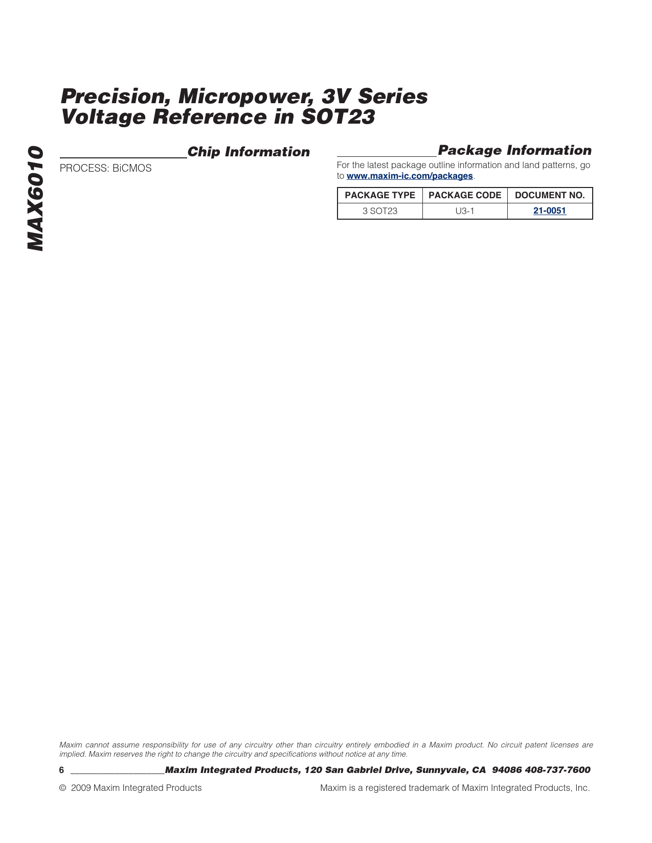 Precision, Micropower, 3V Series Voltage Reference in SOT23. Chip Information. Package Information. www.maxim-ic.com/packages