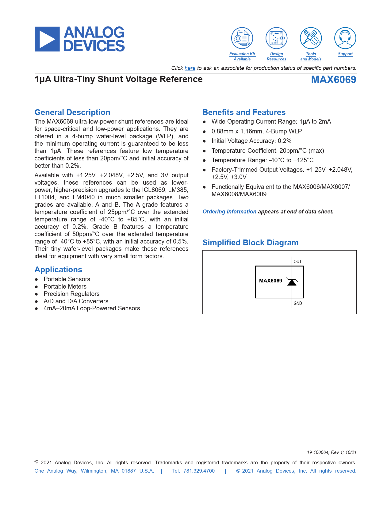 Evaluation Kit. Design. Tools. Support. Available. Resources. and Models. 1μA Ultra-Tiny Shunt Voltage Reference. MAX6069