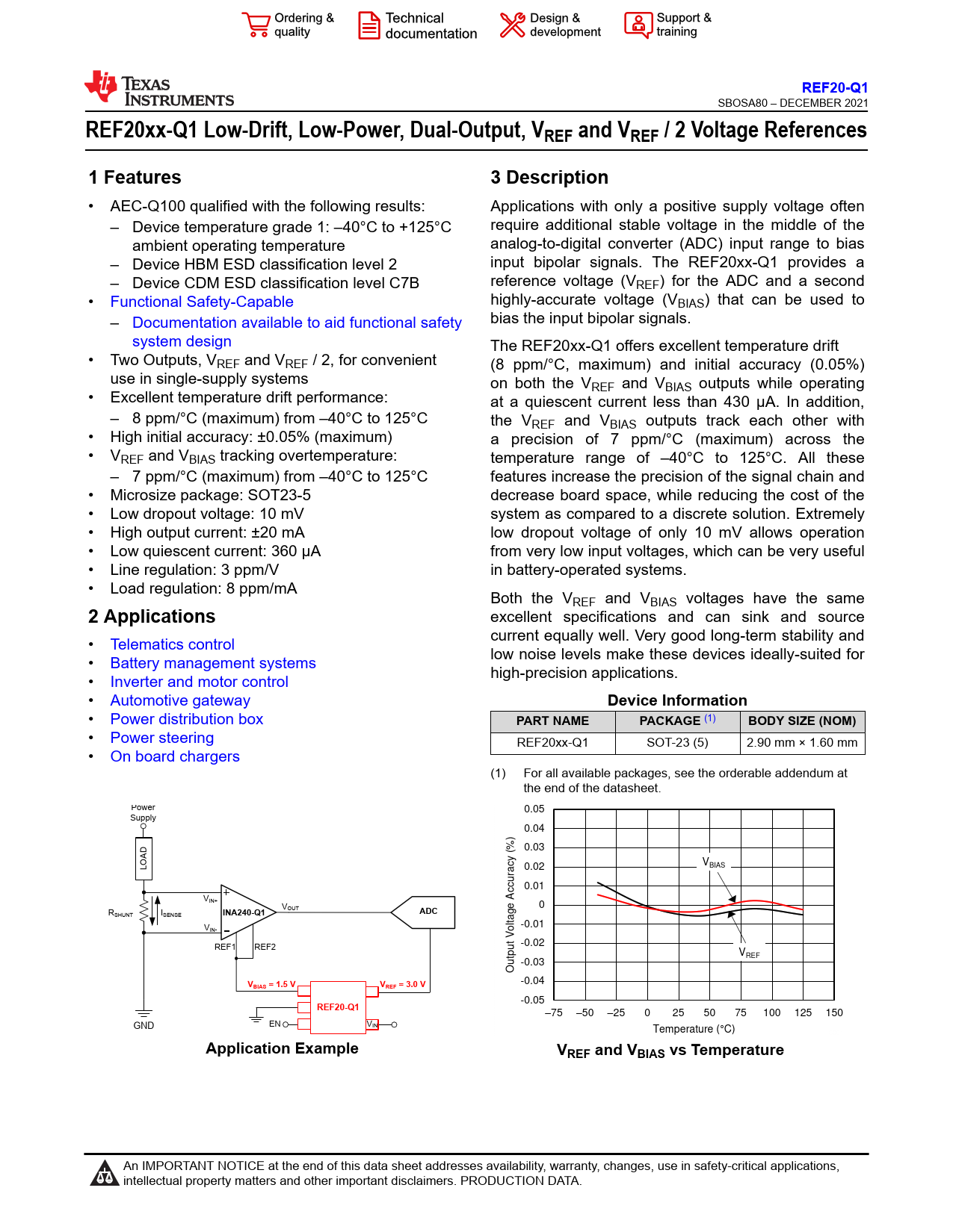 link to page 1 REF20-Q1 SBOSA80 – DECEMBER 2021 REF20xx-Q1 Low-Drift, Low-Power, Dual-Output, VREF and VREF / 2 Voltage References1 Features3 Description • AEC-Q100 qualified with the following results: Applications with only a positive supply voltage often – Device temperature grade 1: –40°C to +125°C require additional stable voltage in the middle of the ambient operating temperature analog-to-digital converter (ADC) input range to bias – Device HBM ESD classification level 2 input bipolar signals. The REF20xx-Q1 provides a – Device CDM ESD classification level C7B reference voltage (VREF) for the ADC and a second • Functional Safety-Capable highly-accurate voltage (VBIAS) that can be used to – Documentation available to aid functional safety bias the input bipolar signals. system design The REF20xx-Q1 offers excellent temperature drift • Two Outputs, VREF and VREF / 2, for convenient (8 ppm/°C, maximum) and initial accuracy (0.05%) use in single-supply systems on both the VREF and VBIAS outputs while operating • Excellent temperature drift performance: at a quiescent current less than 430 µA. In addition, – 8 ppm/°C (maximum) from –40°C to 125°C the VREF and VBIAS outputs track each other with • High initial accuracy: ±0.05% (maximum) a precision of 7 ppm/°C (maximum) across the • VREF and VBIAS tracking overtemperature: temperature range of –40°C to 125°C. All these – 7 ppm/°C (maximum) from –40°C to 125°C features increase the precision of the signal chain and • Microsize package: SOT23-5 decrease board space, while reducing the cost of the • Low dropout voltage: 10 mV system as compared to a discrete solution. Extremely • High output current: ±20 mA low dropout voltage of only 10 mV allows operation • Low quiescent current: 360 μA from very low input voltages, which can be very useful • Line regulation: 3 ppm/V in battery-operated systems. • Load regulation: 8 ppm/mA Both the VREF and VBIAS voltages have the same 2 Applications excellent specifications and can sink and source current equally well. Very good long-term stability and • Telematics control low noise levels make these devices ideally-suited for • Battery management systems high-precision applications. • Inverter and motor control • Automotive gateway Device Information • Power distribution box PART NAMEPACKAGE (1) BODY SIZE (NOM) • Power steering REF20xx-Q1 SOT-23 (5) 2.90 mm × 1.60 mm • On board chargers (1) For all available packages, see the orderable addendum at the end of the datasheet. Power 0.05 Supply 0.04 0.03 (%) y V LOAD c 0.02 BIAS ra u c 0.01 c VIN+ A V e 0 OUT INA240-Q1ADC R g SHUNT ISENSE lta -0.01 VIN- o t V REF1 REF2 -0.02 u tp VREF u -0.03 O VV -0.04 BIAS = 1.5 VREF = 3.0 V -0.05 REF20-Q1 ±75 ±50 ±25 0 25 50 75 100 125 150 EN VIN GND Temperature (ƒC) C001 Application ExampleVREF and VBIAS vs Temperature An IMPORTANT NOTICE at the end of this data sheet addresses availability, warranty, changes, use in safety-critical applications, intellectual property matters and other important disclaimers. PRODUCTION DATA. Document Outline 1 Features 2 Applications 3 Description Table of Contents 4 Revision History 5 Device Comparison Table 6 Pin Configuration and Functions 7 Specifications 7.1 Absolute Maximum Ratings 7.2 ESD Ratings 7.3 Recommended Operating Conditions 7.4 Thermal Information 7.5 Electrical Characteristics 7.6 Typical Characteristics 8 Parameter Measurement Information 8.1 Solder Heat Shift 8.2 Long-Term Stability 8.3 Thermal Hysteresis 8.4 Noise Performance 9 Detailed Description 9.1 Overview 9.2 Functional Block Diagram 9.3 Feature Description 9.3.1 VREF and VBIAS Tracking 9.3.2 Low Temperature Drift 9.3.3 Load Current 9.4 Device Functional Modes 10 Applications and Implementation 10.1 Application Information 10.2 Typical Application 10.2.1 Low-Side, Current-Sensing Application 10.2.1.1 Design Requirements 10.2.1.2 Detailed Design Procedure 10.2.1.2.1 Shunt Resistor 10.2.1.2.2 Differential Amplifier 10.2.1.2.3 Voltage Reference 10.2.1.2.4 Error Calculations 10.2.1.2.5 Application Curves 11 Power-Supply Recommendations 12 Layout 12.1 Layout Guidelines 12.2 Layout Example 13 Device and Documentation Support 13.1 Documentation Support 13.1.1 Related Documentation 13.2 Receiving Notification of Documentation Updates 13.3 Support Resources 13.4 Trademarks 13.5 Electrostatic Discharge Caution 13.6 Glossary 14 Mechanical, Packaging, and Orderable Information