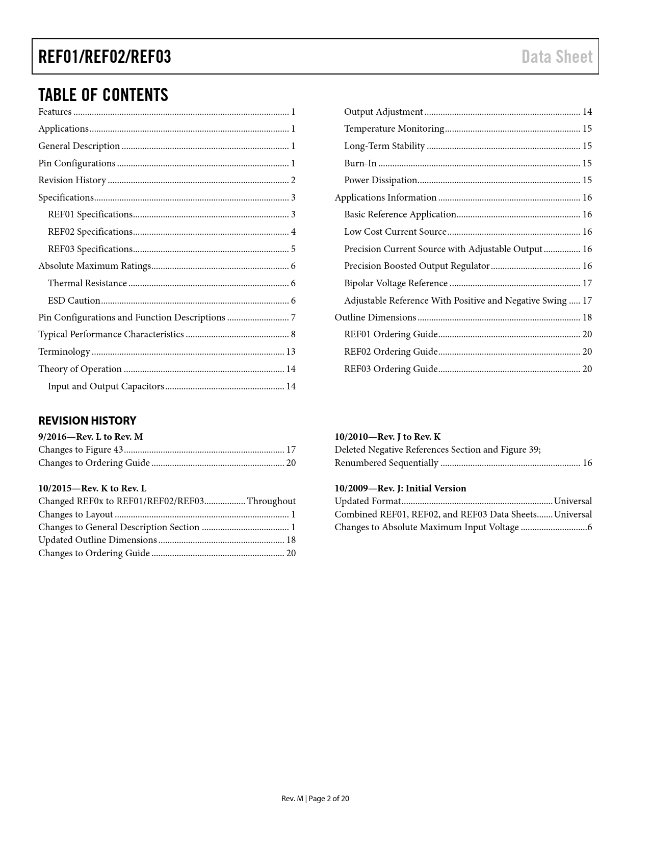 REF01/REF02/REF03. Data Sheet. TABLE OF CONTENTS. REVISION HISTORY 9/2016—Rev. L to Rev. M. 10/2010—Rev. J to Rev. K