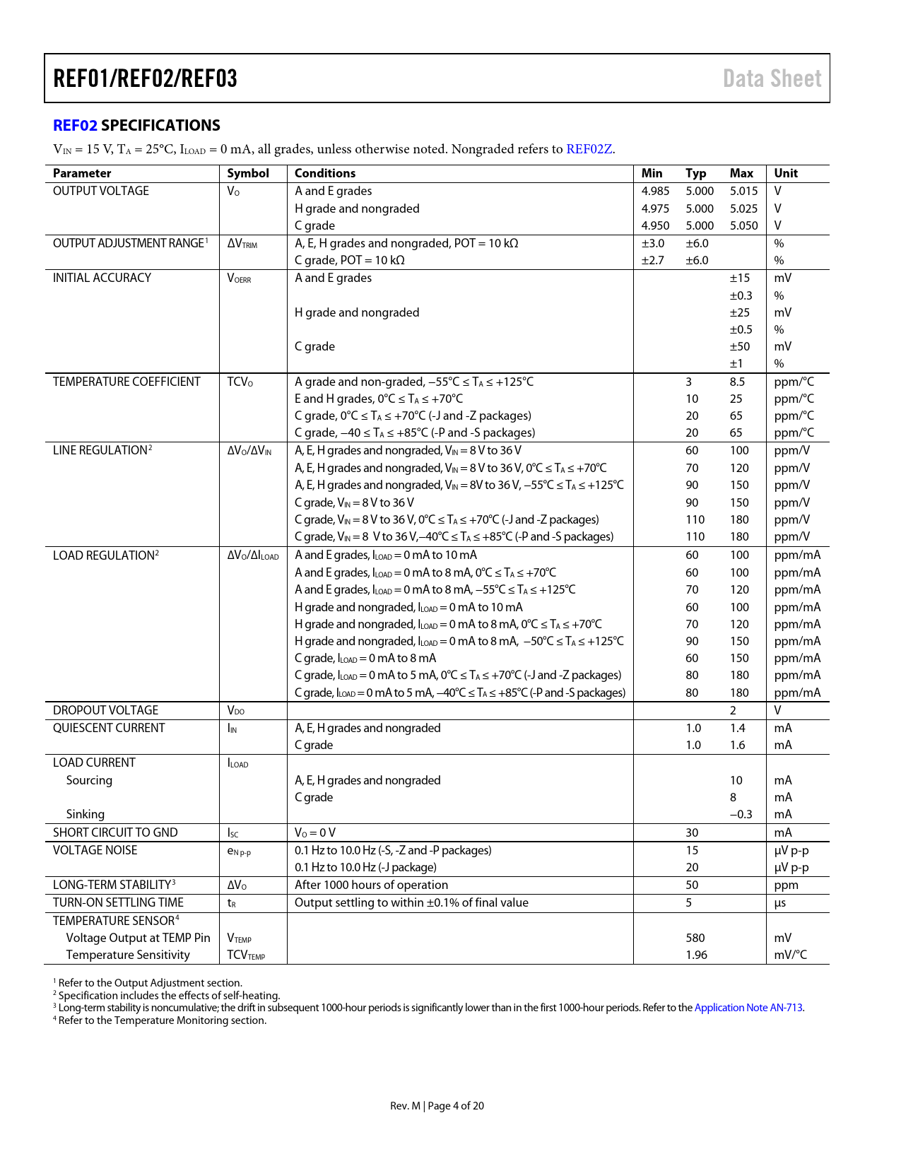 link to page 14 link to page 15 REF01/REF02/REF03Data SheetREF02 SPECIFICATIONS VIN = 15 V, TA = 25°C, ILOAD = 0 mA, all grades, unless otherwise noted. Nongraded refers to REF02Z. ParameterSymbolConditionsMinTypMaxUnit OUTPUT VOLTAGE VO A and E grades 4.985 5.000 5.015 V H grade and nongraded 4.975 5.000 5.025 V C grade 4.950 5.000 5.050 V OUTPUT ADJUSTMENT RANGE1 ΔVTRIM A, E, H grades and nongraded, POT = 10 kΩ ±3.0 ±6.0 % C grade, POT = 10 kΩ ±2.7 ±6.0 % INITIAL ACCURACY VOERR A and E grades ±15 mV ±0.3 % H grade and nongraded ±25 mV ±0.5 % C grade ±50 mV ±1 % TEMPERATURE COEFFICIENT TCVO A grade and non-graded, −55°C ≤ TA ≤ +125°C 3 8.5 ppm/°C E and H grades, 0°C ≤ TA ≤ +70°C 10 25 ppm/°C C grade, 0°C ≤ TA ≤ +70°C (-J and -Z packages) 20 65 ppm/°C C grade, −40 ≤ TA ≤ +85°C (-P and -S packages) 20 65 ppm/°C LINE REGULATION2 ∆VO/∆VIN A, E, H grades and nongraded, VIN = 8 V to 36 V 60 100 ppm/V A, E, H grades and nongraded, VIN = 8 V to 36 V, 0°C ≤ TA ≤ +70°C 70 120 ppm/V A, E, H grades and nongraded, VIN = 8V to 36 V, −55°C ≤ TA ≤ +125°C 90 150 ppm/V C grade, VIN = 8 V to 36 V 90 150 ppm/V C grade, VIN = 8 V to 36 V, 0°C ≤ TA ≤ +70°C (-J and -Z packages) 110 180 ppm/V C grade, VIN = 8 V to 36 V,−40°C ≤ TA ≤ +85°C (-P and -S packages) 110 180 ppm/V LOAD REGULATION2 ∆VO/∆ILOAD A and E grades, ILOAD = 0 mA to 10 mA 60 100 ppm/mA A and E grades, ILOAD = 0 mA to 8 mA, 0°C ≤ TA ≤ +70°C 60 100 ppm/mA A and E grades, ILOAD = 0 mA to 8 mA, −55°C ≤ TA ≤ +125°C 70 120 ppm/mA H grade and nongraded, ILOAD = 0 mA to 10 mA 60 100 ppm/mA H grade and nongraded, ILOAD = 0 mA to 8 mA, 0°C ≤ TA ≤ +70°C 70 120 ppm/mA H grade and nongraded, ILOAD = 0 mA to 8 mA, −50°C ≤ TA ≤ +125°C 90 150 ppm/mA C grade, ILOAD = 0 mA to 8 mA 60 150 ppm/mA C grade, ILOAD = 0 mA to 5 mA, 0°C ≤ TA ≤ +70°C (-J and -Z packages) 80 180 ppm/mA C grade, ILOAD = 0 mA to 5 mA, −40°C ≤ TA ≤ +85°C (-P and -S packages) 80 180 ppm/mA DROPOUT VOLTAGE VDO 2 V QUIESCENT CURRENT IIN A, E, H grades and nongraded 1.0 1.4 mA C grade 1.0 1.6 mA LOAD CURRENT ILOAD Sourcing A, E, H grades and nongraded 10 mA C grade 8 mA Sinking −0.3 mA SHORT CIRCUIT TO GND ISC VO = 0 V 30 mA VOLTAGE NOISE eN p-p 0.1 Hz to 10.0 Hz (-S, -Z and -P packages) 15 µV p-p 0.1 Hz to 10.0 Hz (-J package) 20 µV p-p LONG-TERM STABILITY3 ∆VO After 1000 hours of operation 50 ppm TURN-ON SETTLING TIME tR Output settling to within ±0.1% of final value 5 µs TEMPERATURE SENSOR4 Voltage Output at TEMP Pin VTEMP 580 mV Temperature Sensitivity TCVTEMP 1.96 mV/°C 1 Refer to the Output Adjustment section. 2 Specification includes the effects of self-heating. 3 Long-term stability is noncumulative; the drift in subsequent 1000-hour periods is significantly lower than in the first 1000-hour periods. Refer to the Application Note AN-713. 4 Refer to the Temperature Monitoring section. Rev. M | Page 4 of 20 Document Outline FEATURES APPLICATIONS GENERAL DESCRIPTION PIN CONFIGURATIONS TABLE OF CONTENTS REVISION HISTORY SPECIFICATIONS REF01 SPECIFICATIONS REF02 SPECIFICATIONS REF03 SPECIFICATIONS ABSOLUTE MAXIMUM RATINGS THERMAL RESISTANCE ESD CAUTION PIN CONFIGURATIONS AND FUNCTION DESCRIPTIONS TYPICAL PERFORMANCE CHARACTERISTICS TERMINOLOGY THEORY OF OPERATION INPUT AND OUTPUT CAPACITORS OUTPUT ADJUSTMENT TEMPERATURE MONITORING LONG-TERM STABILITY BURN-IN POWER DISSIPATION APPLICATIONS INFORMATION BASIC REFERENCE APPLICATION LOW COST CURRENT SOURCE PRECISION CURRENT SOURCE WITH ADJUSTABLE OUTPUT PRECISION BOOSTED OUTPUT REGULATOR BIPOLAR VOLTAGE REFERENCE ADJUSTABLE REFERENCE WITH POSITIVE AND NEGATIVE SWING OUTLINE DIMENSIONS REF01 ORDERING GUIDE REF02 ORDERING GUIDE REF03 ORDERING GUIDE