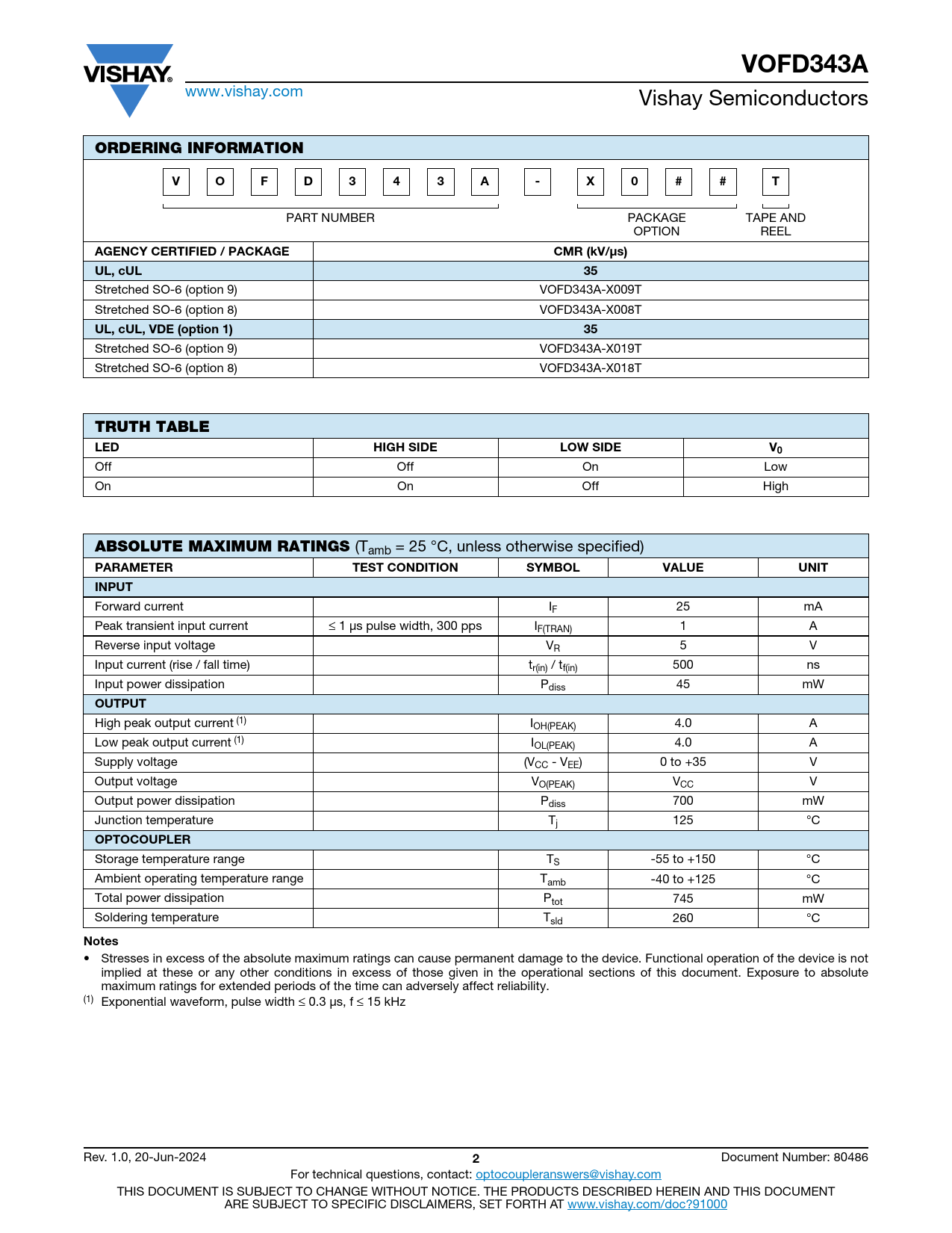 VOFD343A. ORDERING INFORMATION. AGENCY CERTIFIED / PACKAGE. CMR (kV/μs). UL, cUL. UL, cUL, VDE (option 1). TRUTH TABLE LED. HIGH SIDE