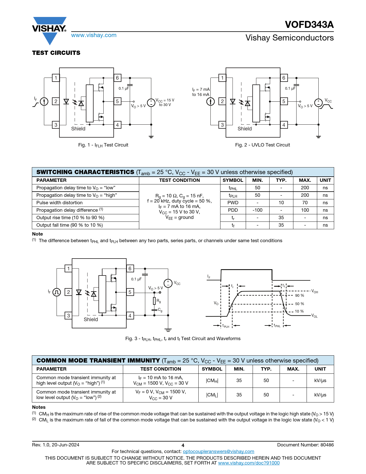 VOFD343A www.vishay.com Vishay Semiconductors TEST CIRCUITS 1 6 1 6 0.1 µF I = 7 mA 0.1 µF F to 16 mA IF + V = 15 V 2 5 + V CC 2 5 CC V > 5 V to 30 V V > 5 V O O 3 4 3 4 Shield Shield Fig. 1 - IFLH Test Circuit Fig. 2 - UVLO Test Circuit SWITCHING CHARACTERISTICS (Tamb = 25 °C, VCC - VEE = 30 V unless otherwise specified) PARAMETERTEST CONDITIONSYMBOLMIN.TYP.MAX.UNIT Propagation delay time to VO = “low” tPHL 50 - 200 ns Propagation delay time to VO = “high” Rg = 10 Ω, Cg = 15 nF, tPLH 50 - 200 ns f = 20 kHz, duty cycle = 50 %, Pulse width distortion PWD - 10 70 ns IF = 7 mA to 16 mA, Propagation delay difference (1) V PDD -100 - 100 ns CC = 15 V to 30 V, Output rise time (10 % to 90 %) VEE = ground tr - 35 - ns Output fall time (90 % to 10 %) tf - 35 - ns Note (1) The difference between tPHL and tPLH between any two parts, series parts, or channels under same test conditions 1 6 I 0.1 µF F + VCC t t V > 5 V r f O IF 2 5 VOH 90 % Rg VO 50 % Cg 10 % 3 4 VOL Shield t t PLH PHL Fig. 3 - tPLH, tPHL, tr and tf Test Circuit and Waveforms COMMON MODE TRANSIENT IMMUNITY (Tamb = 25 °C, VCC - VEE = 30 V unless otherwise specified) PARAMETERTEST CONDITIONSYMBOLMIN.TYP.MAX.UNIT Common mode transient immunity at IF = 10 mA to 16 mA, |CM high level output (V H| 35 50 - kV/μs O = “high”) (1) VCM = 1500 V, VCC = 30 V Common mode transient immunity at VF = 0 V, VCM = 1500 V, |CM low level output (V L| 35 50 - kV/μs O = “low”) (2) VCC = 30 V Notes (1) CMH is the maximum rate of rise of the common mode voltage that can be sustained with the output voltage in the logic high state (VO > 15 V) (2) CML is the maximum rate of fall of the common mode voltage that can be sustained with the output voltage in the logic low state (VO < 1 V) Rev. 1.0, 20-Jun-2024 4 Document Number: 80486 For technical questions, contact: optocoupleranswers@vishay.com THIS DOCUMENT IS SUBJECT TO CHANGE WITHOUT NOTICE. THE PRODUCTS DESCRIBED HEREIN AND THIS DOCUMENT ARE SUBJECT TO SPECIFIC DISCLAIMERS, SET FORTH AT www.vishay.com/doc?91000