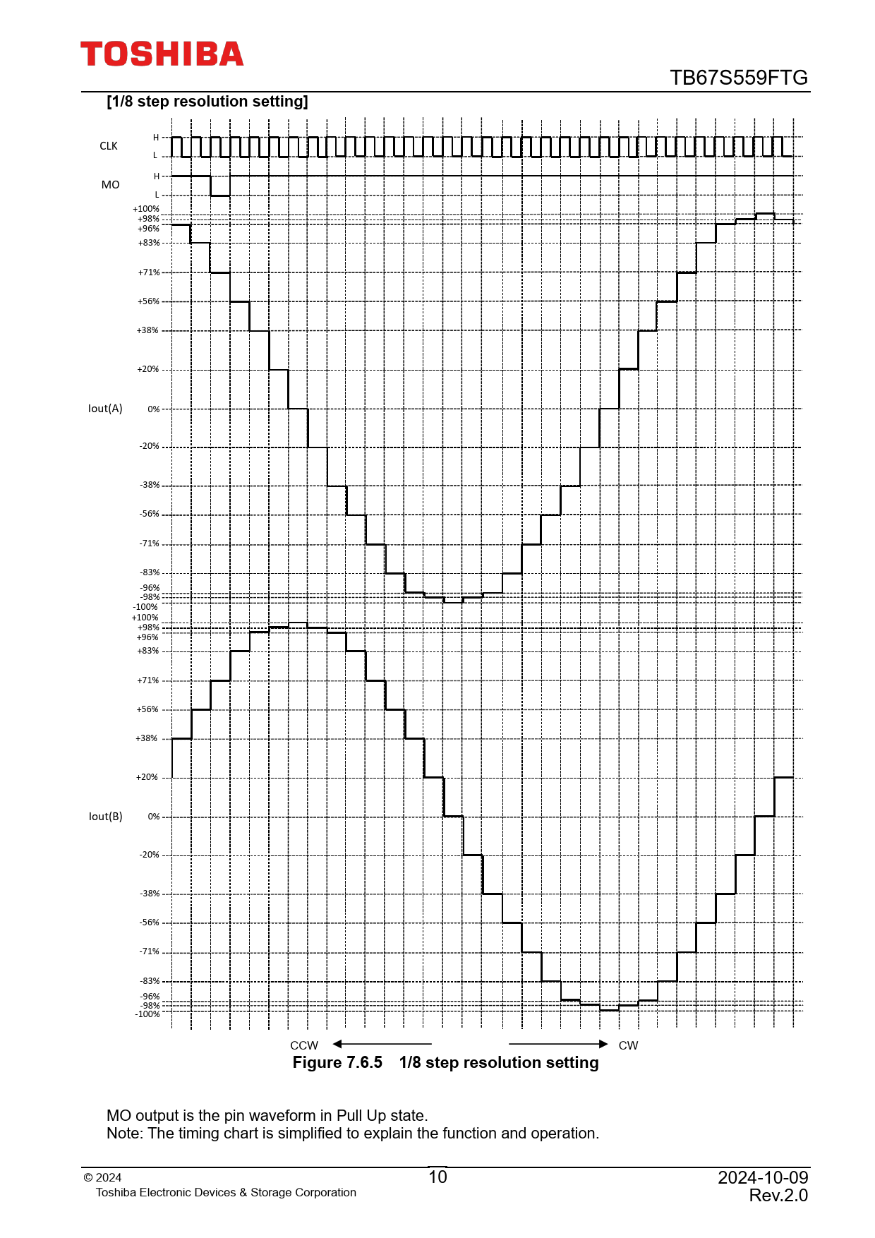 MO output is the pin waveform in Pull Up state. Note: The timing chart is simplified to explain the function and operation. © 2 024 10 2024-10-09 Toshiba Electronic Devices & Storage Corporation Rev.2.0 Document Outline BiCD constant-current 2-phase bipolar stepping motor driver IC 1. Description 2. Features 3. Pin assignment 4. Block diagram 5. Pin Description 6. Input / Output Equivalent Circuit 7. Functional Description 7.1. Function of SLEEP_X 7.2. Function of CLK 7.3. Function of ENABLE 7.4. Function of CW/CCW 7.5. Function of DMODE0, DMODE1,DMODE2 7.6. Sequence by drive mode in clock input control mode 7.7. Excitation method and set current value 7.8. Selectable Mixed Decay Function 7.9. Mixed Decay current waveform 1 7.10. For each time of constant-current PWM operation 7.11. Mixed Decay current waveform 2 7.12. ADMD (Advanced Dynamic Mixed Decay) Constant current control 7.13. ADMD (Advanced Dynamic Mixed Decay) current waveform 1 7.14. ADMD (Advanced Dynamic Mixed Decay) current waveform 2 7.15. Function of RESET 7.16. Torque Function 7.17. Function of MO 7.18. LO (error detection flag output) Function 8. Output stage transistor operation mode (Advanced Dynamic Mixed Decay) 8.1. Functions of output stage transistor operation 9. About the set current value (IOUT) 10. About chopping frequency (fCHOP) 11. Power Consumption of IC 11.1. Power consumption of power transistor section 11.2. Power consumption of logic and IM systems 11.3. Power consumption 12. About the detection function 13. Overheat detection (This function is a latch type that maintains operation at the time of detection.) 14. Overcurrent detection (This function is a latch type that maintains operation at the time of detection.) 15. Absolute Maximum Ratings (Ta = 25 C) 16. PD-Ta graph (for reference) 17. Operating range (Ta = -40 to 85 C) 18. Electrical Specifications 18.1. Electrical Specifications 1(Ta = 25 C, VM = 24 V unless otherwise specified) 18.2. Electrical Specifications 2 (Ta = 25 C, VM = 24 V unless otherwise specified) 18.2.1. With respect to back EMF 18.2.2. Overcurrent and overheat detection 18.2.3. Handling of ICs 19. AC electrical characteristics (Ta = 25 C, VM = 24V) 20. AC Characteristics Timing Chart 21. Application Circuit Example 22. Package Information 23. Notes on Contents 24. IC Usage Considerations 24.1. Notes on Handling of ICs 24.2. Points to Remember on Handling of ICs RESTRICTIONS ON PRODUCT USE