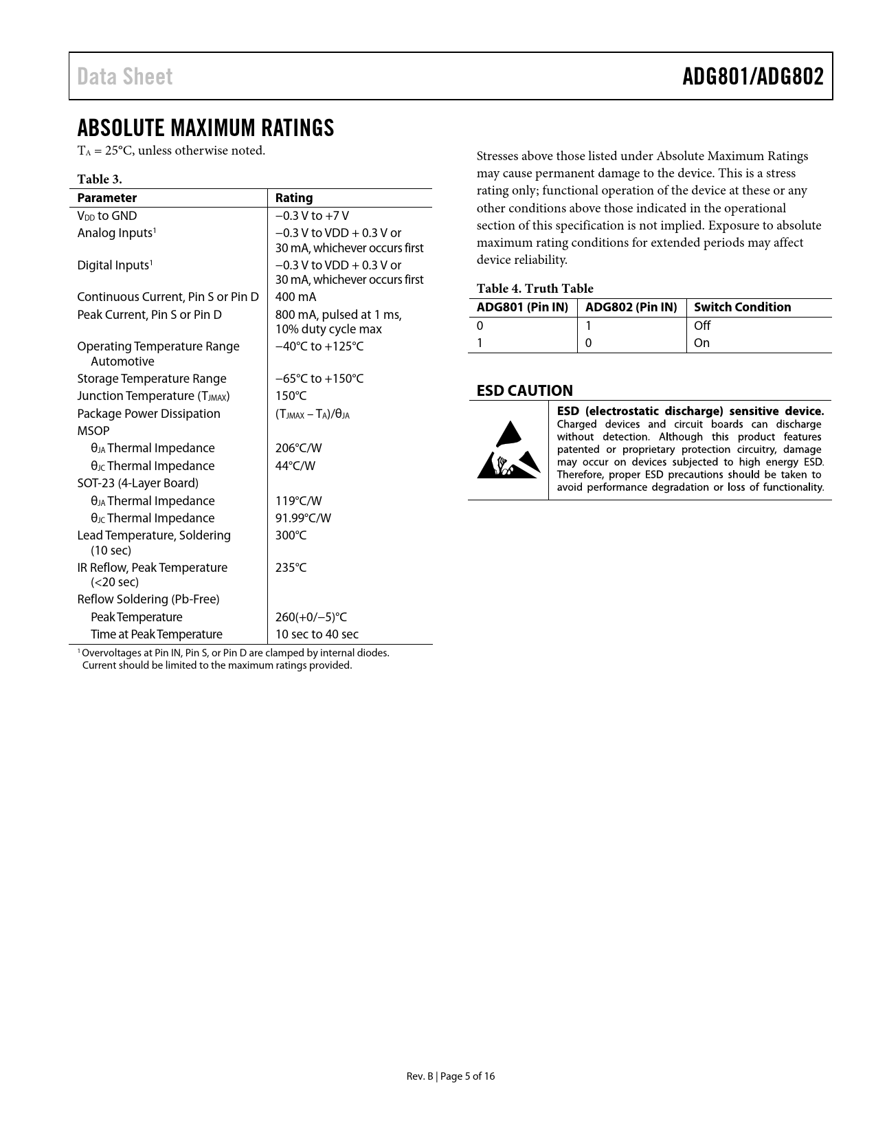 Pages / Page16 / 5 — Data Sheet. ADG801/ADG802. ABSOLUTE MAXIMUM RATINGS. Table 3. Parameter …