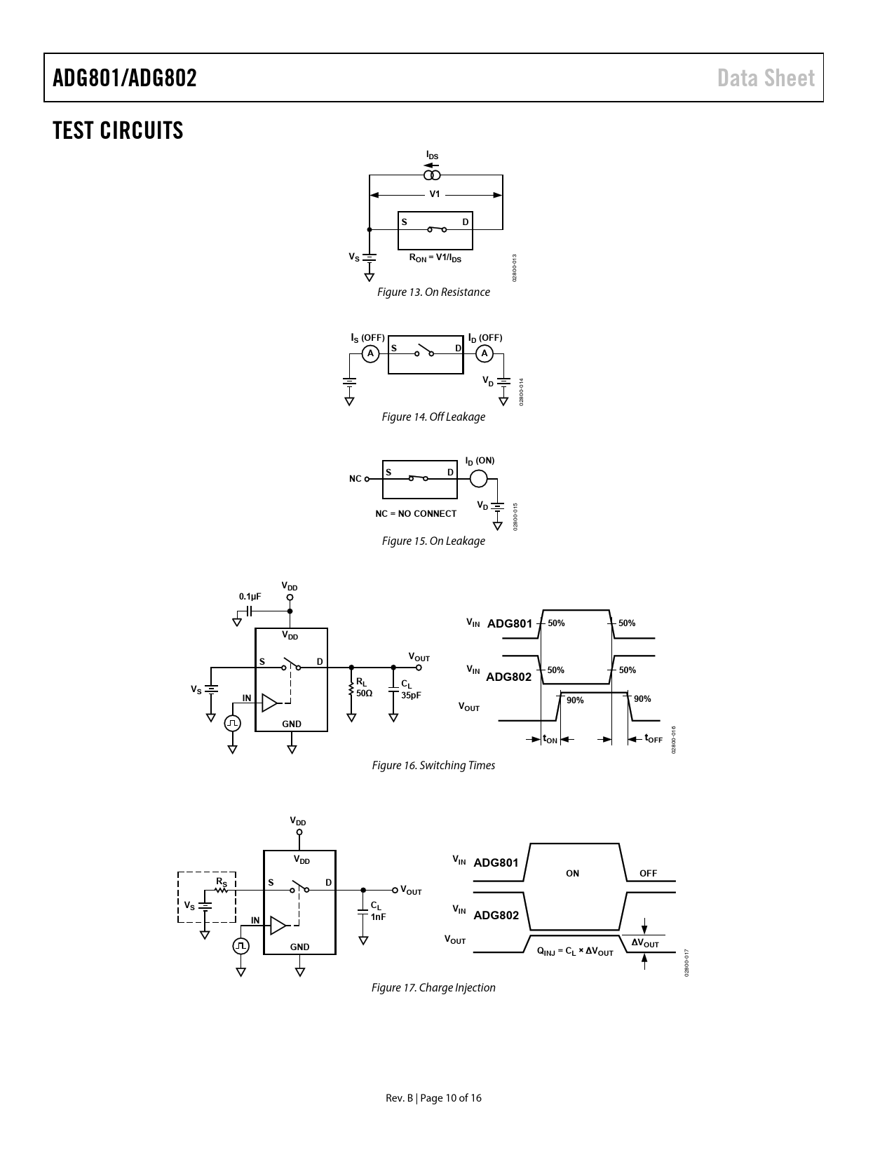 | Pages / Page | 16 / 10 — ADG801/ADG802. Data Sheet. TEST CIRCUITS. IDS. RON = V1/IDS. IS (OFF). ID … |