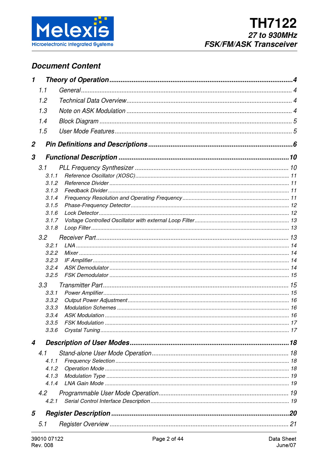 link to page 4 link to page 4 link to page 4 link to page 4 link to page 4 link to page 4 link to page 4 link to page 4 link to page 5 link to page 5 link to page 5 link to page 5 link to page 6 link to page 6 link to page 10 link to page 10 link to page 10 link to page 10 link to page 11 link to page 11 link to page 11 link to page 11 link to page 11 link to page 11 link to page 11 link to page 11 link to page 11 link to page 11 link to page 11 link to page 11 link to page 11 link to page 11 link to page 11 link to page 11 link to page 12 link to page 12 link to page 12 link to page 12 link to page 12 link to page 12 link to page 12 link to page 12 link to page 13 link to page 13 link to page 13 link to page 13 link to page 13 link to page 13 link to page 13 link to page 13 link to page 13 link to page 13 link to page 14 link to page 14 link to page 14 link to page 14 link to page 14 link to page 14 link to page 14 link to page 14 link to page 14 link to page 14 link to page 14 link to page 14 link to page 14 link to page 14 link to page 14 link to page 14 link to page 15 link to page 15 link to page 15 link to page 15 link to page 15 link to page 15 link to page 15 link to page 15 link to page 15 link to page 15 link to page 16 link to page 16 link to page 16 link to page 16 link to page 16 link to page 16 link to page 16 link to page 16 link to page 16 link to page 16 link to page 16 link to page 16 link to page 17 link to page 17 link to page 17 link to page 17 link to page 17 link to page 17 link to page 17 link to page 17 link to page 18 link to page 18 link to page 18 link to page 18 link to page 18 link to page 18 link to page 18 link to page 18 link to page 18 link to page 18 link to page 18 link to page 18 link to page 19 link to page 19 link to page 19 link to page 19 link to page 19 link to page 19 link to page 19 link to page 19 link to page 19 link to page 19 link to page 19 link to page 19 link to page 19 link to page 19 link to page 20 link to page 20 link to page 21 link to page 21 TH712227 to 930MHzFSK/FM/ASK TransceiverDocument Content1Theory of Operation ...4 1.1 General ... 4 1.2 Technical Data Overview.. 4 1.3 Note on ASK Modulation .. 4 1.4 Block Diagram .. 5 1.5 User Mode Features ... 5 2Pin Definitions and Descriptions ..63Functional Description ..10 3.1 PLL Frequency Synthesizer ... 10 3.1.1 Reference Oscillator (XOSC)... 11 3.1.2 Reference Divider .. 11 3.1.3 Feedback Divider ... 11 3.1.4 Frequency Resolution and Operating Frequency .. 11 3.1.5 Phase-Frequency Detector .. 12 3.1.6 Lock Detector... 12 3.1.7 Voltage Controlled Oscillator with external Loop Filter.. 13 3.1.8 Loop Filter .. 13 3.2 Receiver Part .. 13 3.2.1 LNA .. 14 3.2.2 Mixer .. 14 3.2.3 IF Amplifier ... 14 3.2.4 ASK Demodulator .. 14 3.2.5 FSK Demodulator .. 15 3.3 Transmitter Part .. 15 3.3.1 Power Amplifier.. 15 3.3.2 Output Power Adjustment .. 16 3.3.3 Modulation Schemes ... 16 3.3.4 ASK Modulation ... 16 3.3.5 FSK Modulation ... 17 3.3.6 Crystal Tuning.. 17 4Description of User Modes..18 4.1 Stand-alone User Mode Operation ... 18 4.1.1 Frequency Selection .. 18 4.1.2 Operation Mode ... 18 4.1.3 Modulation Type .. 19 4.1.4 LNA Gain Mode ... 19 4.2 Programmable User Mode Operation... 19 4.2.1 Serial Control Interface Description ... 19 5Register Description ..20 5.1 Register Overview .. 21 39010 07122 Page 2 of 44 Data Sheet Rev. 008 June/07 Document Outline Features Ordering Information Application Examples Pin Description General Description Document Content 1 Theory of Operation 1.1 General 1.2 Technical Data Overview 1.3 Note on ASK Operation 1.4 Block Diagram 1.5 User Mode Features 2 Pin Definitions and Descriptions 3 Functional Description 3.1 PLL Frequency Synthesizer 3.1.1 Reference Oscillator (XOSC) 3.1.2 Reference Divider 3.1.3 Feedback Divider 3.1.4 Frequency Resolution and Operating Frequency 3.1.5 Phase-Frequency Detector 3.1.6 Lock Detector 3.1.7 Voltage Controlled Oscillator with external Loop Filter 3.1.8 Loop Filter Receiver Part 3.2.1 LNA 3.2.2 Mixer 3.2.3 IF Amplifier 3.2.4 ASK Demodulator 3.2.5 FSK Demodulator 3.3 Transmitter Part 3.3.1 Power Amplifier Output Power Adjustment 3.3.3 Modulation Schemes 3.3.4 ASK Modulation 3.3.5 FSK Modulation 3.3.6 Crystal Tuning 4 Description of User Modes 4.1 Stand-alone User Mode Operation 4.1.1 Frequency Selection 4.1.2 Operation Mode 4.1.3 Modulation Type 4.1.4 LNA Gain Mode 4.2 Programmable User Mode Operation 4.2.1 Serial Control Interface Description 5 Register Description 5.1 Register Overview 5.1.1 Default Register Settings for FS0, FS1 5.1.2 A – word 5.1.3 B – word 5.1.4 C – word 5.1.5 D – word 6 Technical Data 6.1 Absolute Maximum Ratings 6.2 Normal Operating Conditions 6.3 DC Characteristics 6.4 PLL Synthesizer Timings 6.5 AC Characteristics of the Receiver Part 6.6 AC Characteristics of the Transmitter Part 6.7 Serial Control Interface 6.8 Crystal Parameters 7 Application Circuit Examples 7.1 FSK Application Circuit Programmable User Mode (internal AFC option) 7.2 FSK Application Circuit Stand-alone User Mode 7.3 FSK Test Circuit Component List (Fig. 14 and Fig. 15) 7.4 ASK Application Circuit Programmable User Mode (normal data slicer option) 7.5 ASK Test Circuit Component List (Fig. 16) 7.6 ASK Application Circuit Programmable User Mode (peak detector option) 7.7 ASK Test Circuit Component List (Fig. 17) 8 Extended Frequency Range 8.1 Board Component List (Fig. 18) 9 TX/RX Combining Network 9.1 Board Component List (Fig. 19) 9.2 Typical LNA S-Parameters in Receive Mode 9.3 LNA Input Impedances in Transmit Mode 10 Package Description 10.1 Soldering Information 11 Reliability Information 12 ESD Precautions Your Notes 13 Disclaimer