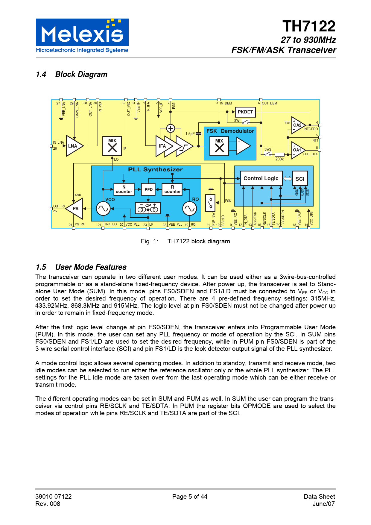 Pages / Page44 / 5 — TH7122. 27 to 930MHz. FSK/FM/ASK Transceiver. 1.4 Block. Diagram. _IF. …