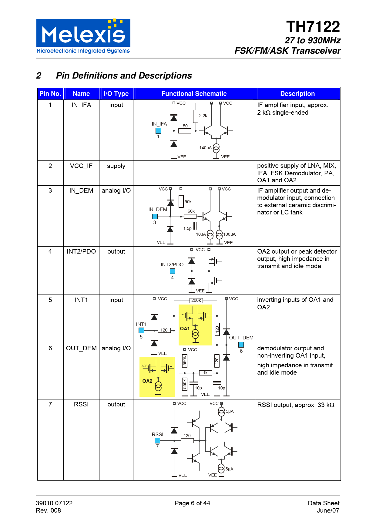 TH712227 to 930MHzFSK/FM/ASK Transceiver2Pin Definitions and DescriptionsPin No.NameI/O TypeFunctional SchematicDescription 1 IN_IFA input VCC VCC IF amplifier input, approx. 2 kΩ single-ended 2.2k IN_IFA 50 1 140µA VEE VEE 2 VCC_IF supply positive supply of LNA, MIX, IFA, FSK Demodulator, PA, OA1 and OA2 3 IN_DEM analog I/O VCC VCC IF amplifier output and de- modulator input, connection 90k to external ceramic discrimi- IN_DEM 60k nator or LC tank 3 1.5p 10µA 100µA VEE VEE 4 INT2/PDO output VCC OA2 output or peak detector output, high impedance in INT2/PDO transmit and idle mode 4 VEE 5 INT1 input VCC VCC 200k inverting inputs of OA1 and OA2 + INT1 0 120 OA1 12 5 OUT_DEM 6 OUT_DEM analog I/O VCC demodulator output and 6 VEE non-inverting OA1 input, 0k 0 12 bias 55 high impedance in transmit 1k and idle mode OA2 550k 10p 10p VEE 7 RSSI output VCC VCC RSSI output, approx. 33 kΩ 5µA RSSI 120 7 5µA VEE VEE 39010 07122 Page 6 of 44 Data Sheet Rev. 008 June/07 Document Outline Features Ordering Information Application Examples Pin Description General Description Document Content 1 Theory of Operation 1.1 General 1.2 Technical Data Overview 1.3 Note on ASK Operation 1.4 Block Diagram 1.5 User Mode Features 2 Pin Definitions and Descriptions 3 Functional Description 3.1 PLL Frequency Synthesizer 3.1.1 Reference Oscillator (XOSC) 3.1.2 Reference Divider 3.1.3 Feedback Divider 3.1.4 Frequency Resolution and Operating Frequency 3.1.5 Phase-Frequency Detector 3.1.6 Lock Detector 3.1.7 Voltage Controlled Oscillator with external Loop Filter 3.1.8 Loop Filter Receiver Part 3.2.1 LNA 3.2.2 Mixer 3.2.3 IF Amplifier 3.2.4 ASK Demodulator 3.2.5 FSK Demodulator 3.3 Transmitter Part 3.3.1 Power Amplifier Output Power Adjustment 3.3.3 Modulation Schemes 3.3.4 ASK Modulation 3.3.5 FSK Modulation 3.3.6 Crystal Tuning 4 Description of User Modes 4.1 Stand-alone User Mode Operation 4.1.1 Frequency Selection 4.1.2 Operation Mode 4.1.3 Modulation Type 4.1.4 LNA Gain Mode 4.2 Programmable User Mode Operation 4.2.1 Serial Control Interface Description 5 Register Description 5.1 Register Overview 5.1.1 Default Register Settings for FS0, FS1 5.1.2 A – word 5.1.3 B – word 5.1.4 C – word 5.1.5 D – word 6 Technical Data 6.1 Absolute Maximum Ratings 6.2 Normal Operating Conditions 6.3 DC Characteristics 6.4 PLL Synthesizer Timings 6.5 AC Characteristics of the Receiver Part 6.6 AC Characteristics of the Transmitter Part 6.7 Serial Control Interface 6.8 Crystal Parameters 7 Application Circuit Examples 7.1 FSK Application Circuit Programmable User Mode (internal AFC option) 7.2 FSK Application Circuit Stand-alone User Mode 7.3 FSK Test Circuit Component List (Fig. 14 and Fig. 15) 7.4 ASK Application Circuit Programmable User Mode (normal data slicer option) 7.5 ASK Test Circuit Component List (Fig. 16) 7.6 ASK Application Circuit Programmable User Mode (peak detector option) 7.7 ASK Test Circuit Component List (Fig. 17) 8 Extended Frequency Range 8.1 Board Component List (Fig. 18) 9 TX/RX Combining Network 9.1 Board Component List (Fig. 19) 9.2 Typical LNA S-Parameters in Receive Mode 9.3 LNA Input Impedances in Transmit Mode 10 Package Description 10.1 Soldering Information 11 Reliability Information 12 ESD Precautions Your Notes 13 Disclaimer