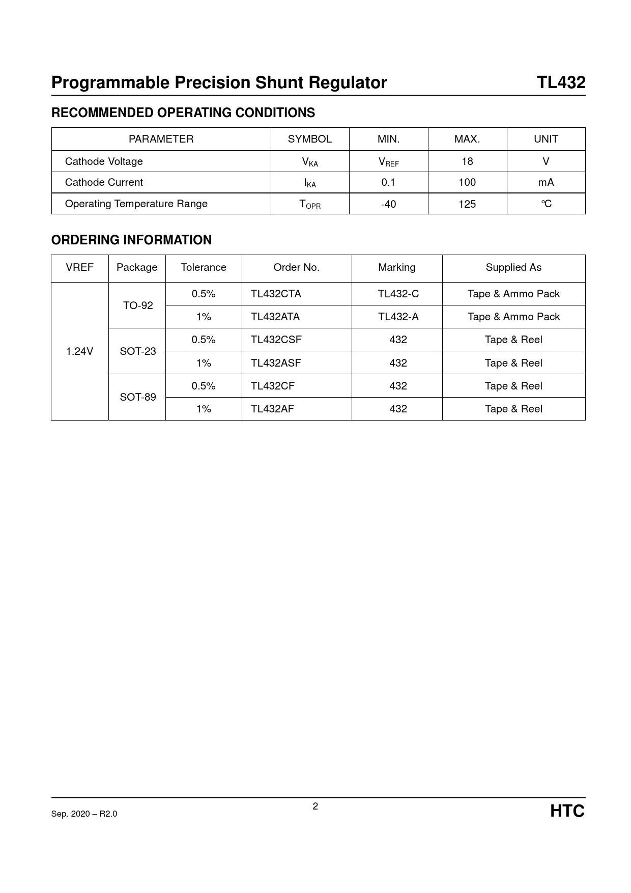 VREF Package Tolerance Order No. Marking Supplied As 0.5% TL432CTA TL432-C Tape & Ammo Pack TO-92 1% TL432ATA TL432-A Tape & Ammo Pack 0.5% TL432CSF 432 Tape & Reel 1.24V SOT-23 1% TL432ASF 432 Tape & Reel 0.5% TL432CF 432 Tape & Reel SOT-89 1% TL432AF 432 Tape & Reel 2 Sep. 2020 – R2.0