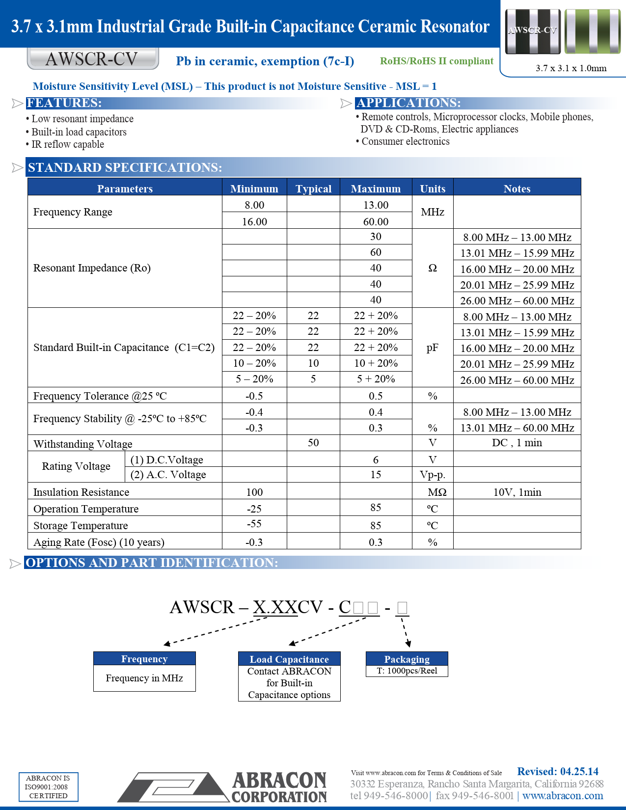 3.7 x 3.1mm Industrial Grade Built-in Capa citance Ceramic Resonator AWSCR-CV. Pb in ceramic, exemption (7c-I)