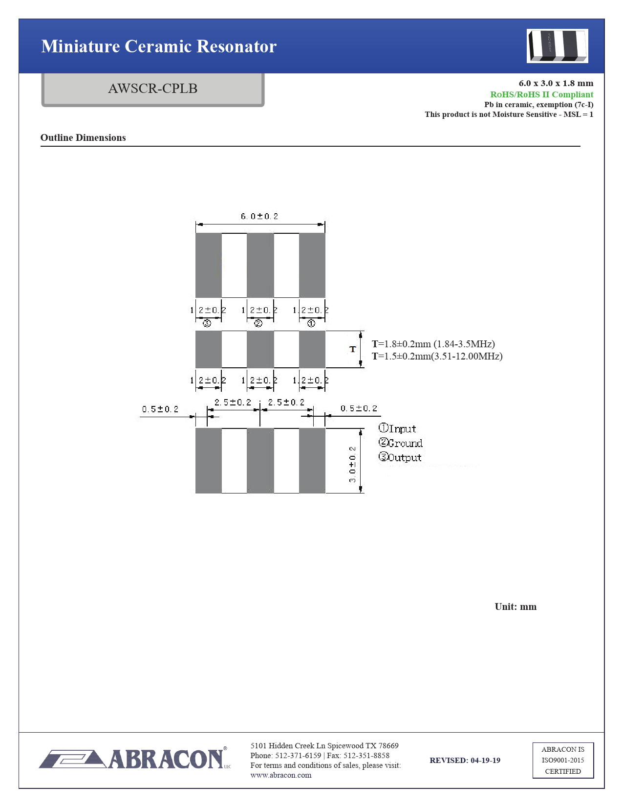 Miniature Ceramic Resonator6.0 x 3.0 x 1.8 mm AWSCR-CPLB RoHS/RoHS II CompliantPb in ceramic, exemption (7c-I)This product is not Moisture Sensitive - MSL = 1Outline DimensionsT =1.8±0.2mm (1.84-3.5MHz) T =1.5±0.2mm(3.51-12.00MHz) Unit: mm 5101 Hidden Creek Ln Spicewood TX 78669 ABRACON IS Phone: 512-371-6159 | Fax: 512-351-8858 REVISED: 04-19-19 ISO9001-2015 For terms and conditions of sales, please visit: CERTIFIED www.abracon.com