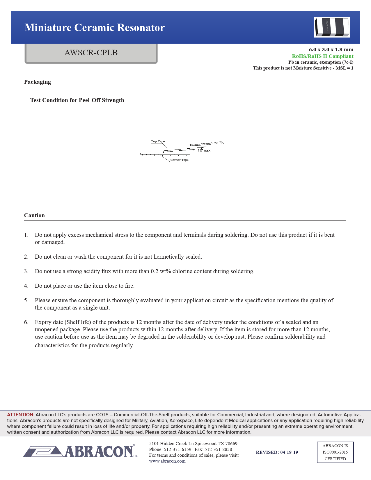 Miniature Ceramic Resonator6.0 x 3.0 x 1.8 mm AWSCR-CPLB RoHS/RoHS II CompliantPb in ceramic, exemption (7c-I)This product is not Moisture Sensitive - MSL = 1PackagingTest Condition for Peel-Off Strength Top Tape Peeling Strength 20- 70g 10 max Carrier Tape Caution 1. Do not apply excess mechanical stress to the component and terminals during soldering. Do not use this product if it is bent or damaged. 2. Do not clean or wash the component for it is not hermetically sealed. 3. Do not use a strong acidity flux with more than 0.2 wt% chlorine content during soldering. 4. Do not place or use the item close to fire. 5. Please ensure the component is thoroughly evaluated in your application circuit as the specification mentions the quality of the component as a single unit. 6. Expiry date (Shelf life) of the products is 12 months after the date of delivery under the conditions of a sealed and an unopened package. Please use the products within 12 months after delivery. If the item is stored for more than 12 months, use caution before use as the item may be degraded in the solderability or develop rust. Please confirm solderability and characteristics for the products regularly. ATTENTION: Abracon LLC’s products are COTS – Commercial-Off-The-Shelf products; suitable for Commercial, Industrial and, where designated, Automotive Applica- tions. Abracon’s products are not specifically designed for Military, Aviation, Aerospace, Life-dependent Medical applications or any application requiring high reliability where component failure could result in loss of life and/or property. For applications requiring high reliability and/or presenting an extreme operating environment, written consent and authorization from Abracon LLC is required. Please contact Abracon LLC for more information. 5101 Hidden Creek Ln Spicewood TX 78669 ABRACON IS Phone: 512-371-6159 | Fax: 512-351-8858 REVISED: 04-19-19 ISO9001-2015 For terms and conditions of sales, please visit: CERTIFIED www.abracon.com