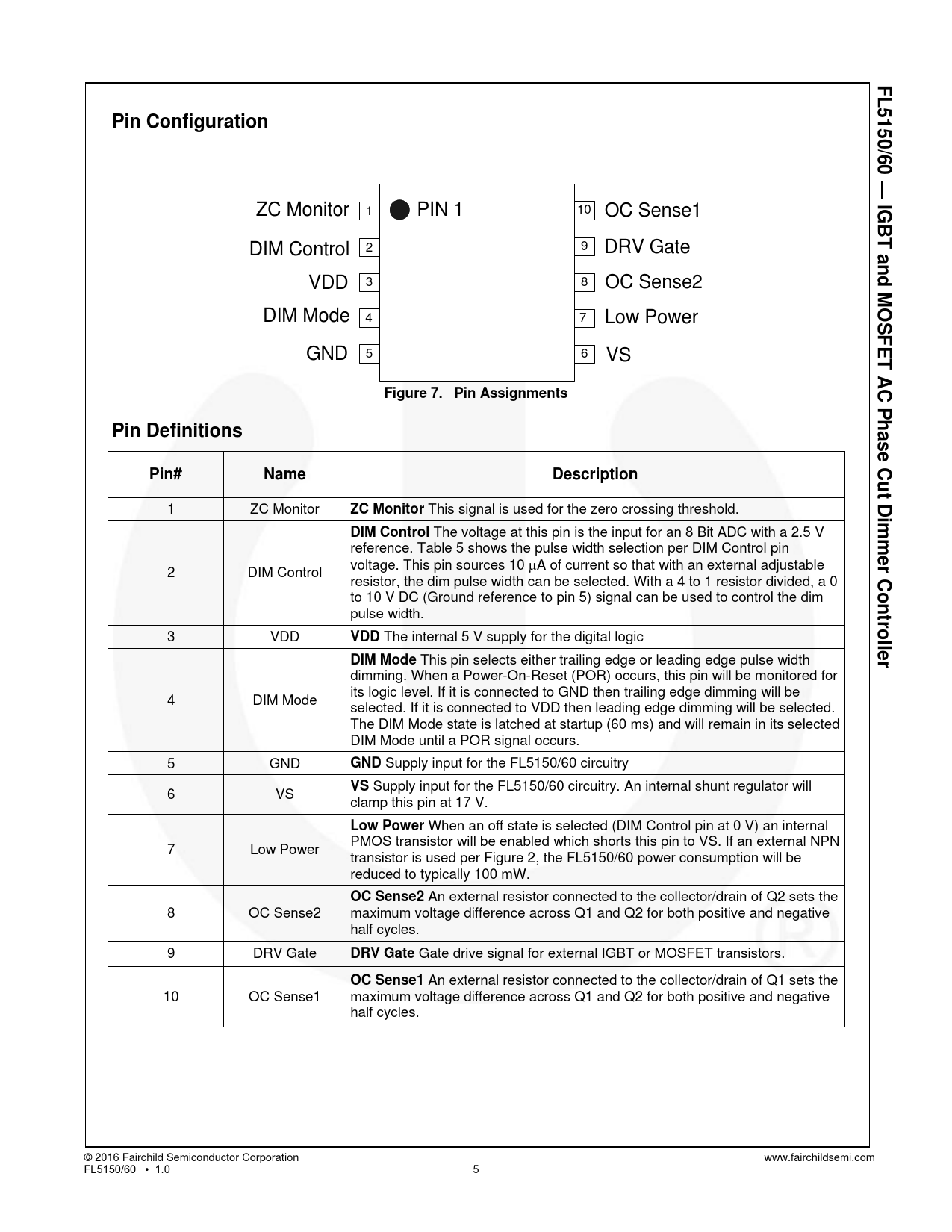 FL5150/60 • 1.0 FL5150/60 — IGBT and MOSFET AC Phase Cut Dimmer Controller Pin Configuration www.fairchildsemi.com