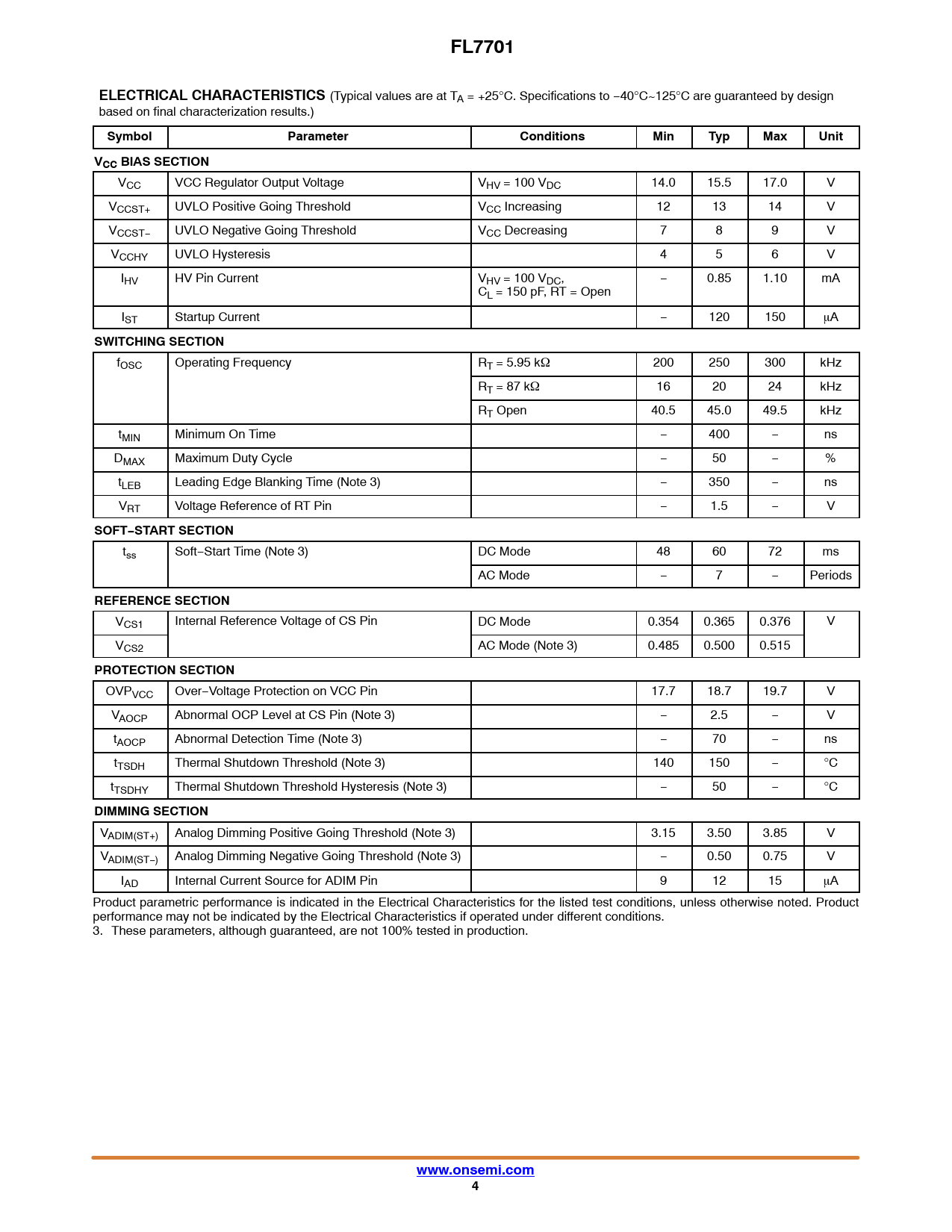 Pages / Page12 / 4 — FL7701. ELECTRICAL CHARACTERISTICS. Symbol. Parameter. Conditions. Min. …