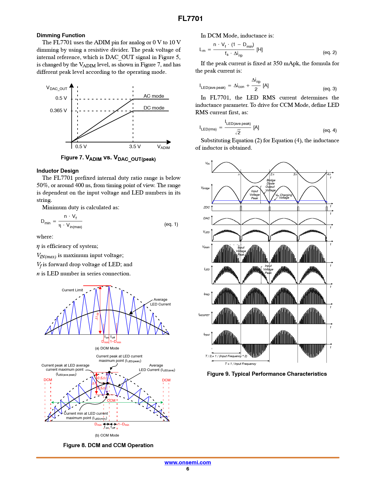 link to page 5 link to page 6 link to page 6 link to page 6 FL7701Dimming Function In DCM Mode, inductance is: The FL7701 uses the ADIM pin for analog or 0 V to 10 V n @ V dimming by using a resistive divider. The peak voltage of L f @ (1 * Dmin) m + [H] f (eq. 2) internal reference, which is DAC_OUT signal in Figure 5, s @ Dirip is changed by the VADIM level, as shown in Figure 7, and has If the peak current is fixed at 350 mApk, the formula for different peak level according to the operating mode. the peak current is: Dirip V I [A] DAC_OUT LED(ave.peak) + Dicon ) 2 (eq. 3) AC mode 0.5 V In FL7701, the LED RMS current determines the inductance parameter. To drive for CCM Mode, define LED DC mode 0.365 V RMS current first, as: ILED(ave.peak) ILED(rms) + [A] 2 Ǹ (eq. 4) Substituting Equation (2) for Equation (4), the inductance 0.5 V 3.5 V VADIM of inductor is obtained. Figure 7. VADIM vs. VDAC_OUT(peak) VIN Inductor Design The FL7701 prefixed internal duty ratio range is below p 2 p 3p 4pt Bridge 50%, or around 400 ns, from timing point of view. The range Diode Vbridge Output is dependent on the input voltage and LED numbers in its Voltage Input Voltage V Chargi dd ng string. Peak Voltage Minimum duty is calculated as: t ZDC n @ V t D f DAC min + h @ V (eq. 1) in(max) t VLED where: h is efficiency of system; t Vdrain Input Voltage VIN(max) is maximum input voltage; Peak Vf is forward drop voltage of LED; and Input t ILED Voltage n is LED number in series connection. Peak t Current Limit IFRD Average LED Current t i rip IMOSFET D t I t input on t off Dmin 1−Dmin (a) DCM Mode t Current peak at LED current T / 2 = 1 / (Input Frequency * 2) maximum point (ILED(peak)) Current peak at LED average Average T = 1 / Input Frequency current maximum point LED Current (ILED(ave)) (ILED(ave.peak)) Figure 9. Typical Performance Characteristics DCM 0.5 i D DCM D i 0.5 iD CCM Current min at LED current maximum point (ILED(min)) Dmin 1−D t min on t off (b) CCM Mode Figure 8. DCM and CCM Operationwww.onsemi.com6