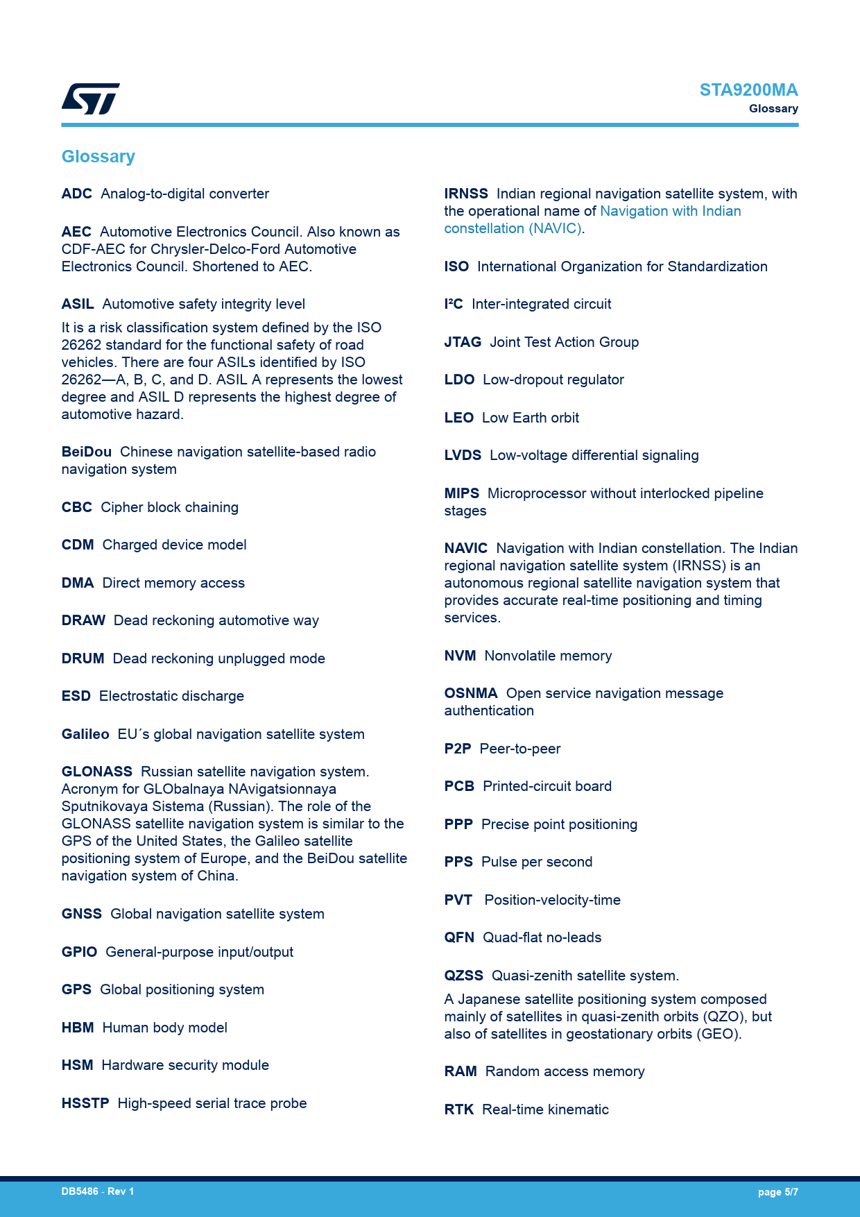 STA9200MA Glossary ADC IRNSS AEC ISO ASIL I²C JTAG LDO LEO BeiDou LVDS MIPS CBC CDM NAVIC DMA DRAW DRUM NVM ESD OSNMA Galileo P2P GLONASS PCB PPP