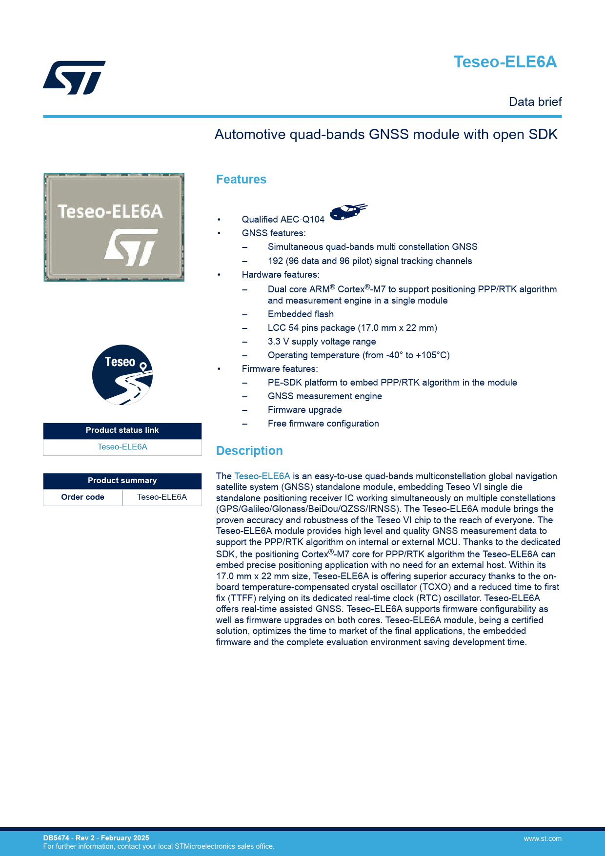 Teseo-ELE6A. Features. Product status link. Description. Product summary. Order code. DB5474. Rev 2. February 2025
