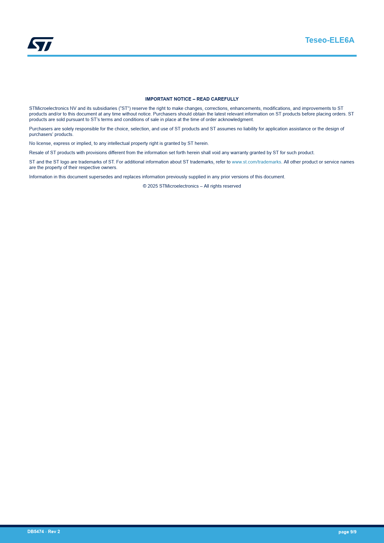 | Pages / Page | 9 / 9 — Teseo-ELE6A. IMPORTANT NOTICE – READ CAREFULLY. DB5474. Rev 2. page 9/9 |