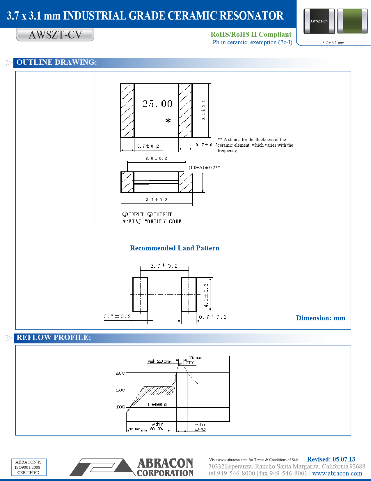 3.7 x 3.1 mm INDUSTRIAL GRADE CERAMIC RESONATOR AWSZT-CV RoHS/RoHS II Compliant OUTLINE DRAWING: Recommended La nd Pattern