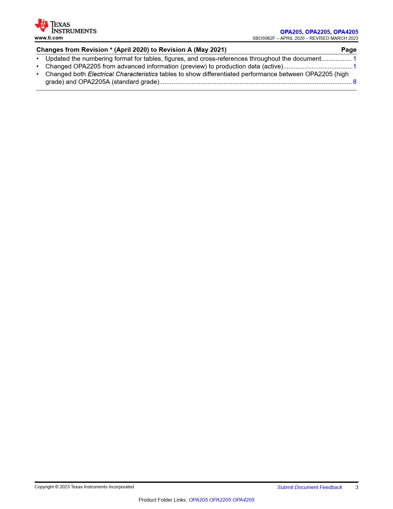 OPA205. , OPA2205. , OPA4205. www.ti.com. Changes from Revision * (April 2020) to Revision A (May 2021). Page