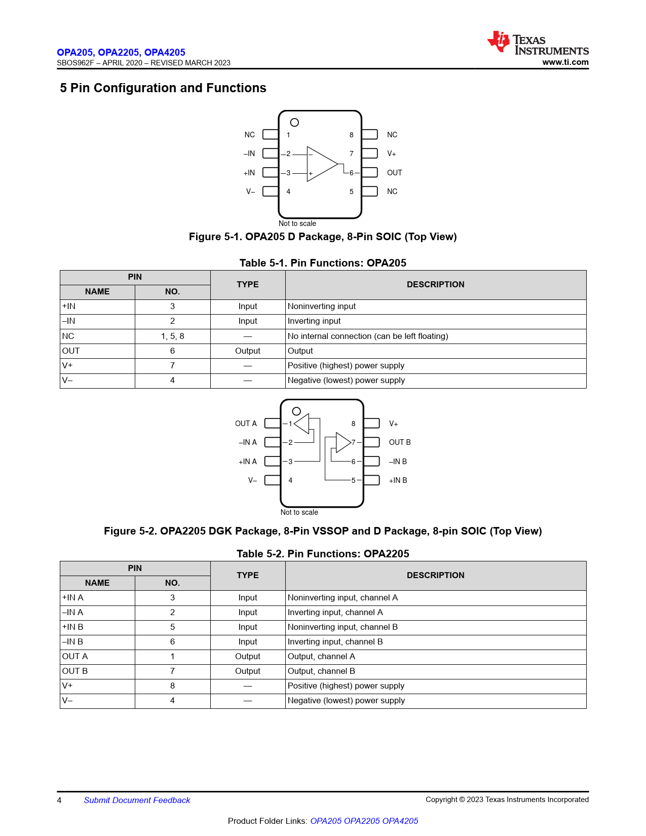 Figure 5-2. OPA2205 DGK Package, 8-Pin VSSOP and D Package, 8-pin SOIC (Top View) Table 5-2. Pin Functions: OPA2205 PIN TYPE DESCRIPTION NAME NO.