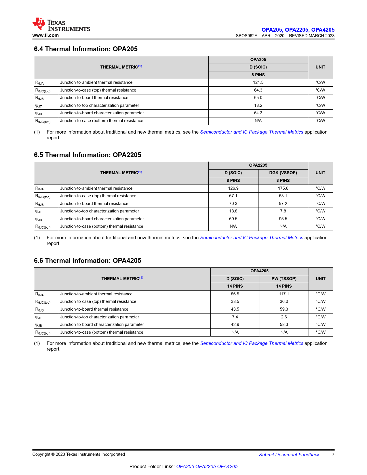 | Pages / Page | 47 / 7 — OPA205. , OPA2205. , OPA4205. www.ti.com. 6.4 Thermal Information: … |