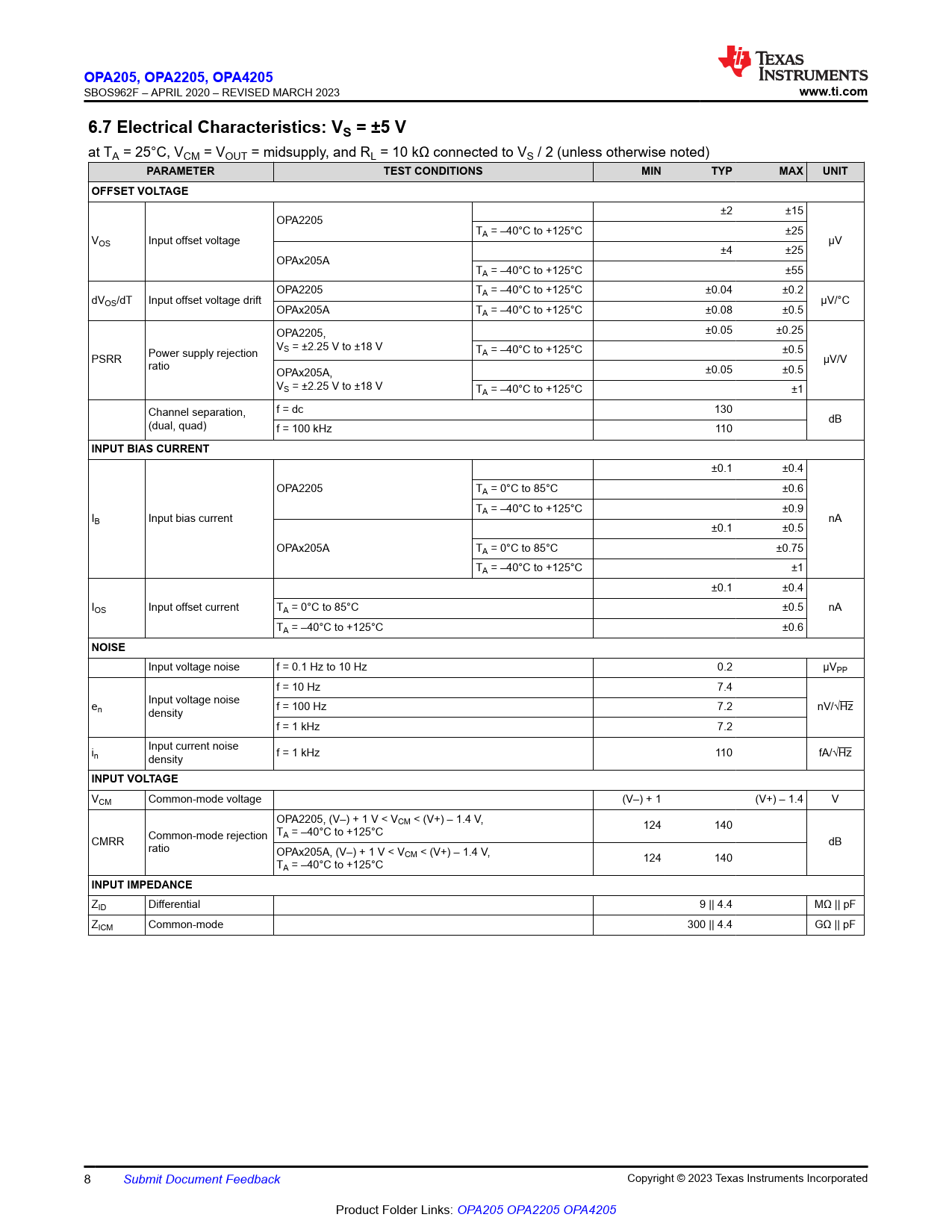 OPA205, OP. A2205, OP. A4205. www.ti.com. 6.7 Electrical Characteristics: VS = ±5 V. PARAMETER. TEST CONDITIONS. MIN. TYP. MAX. UNIT