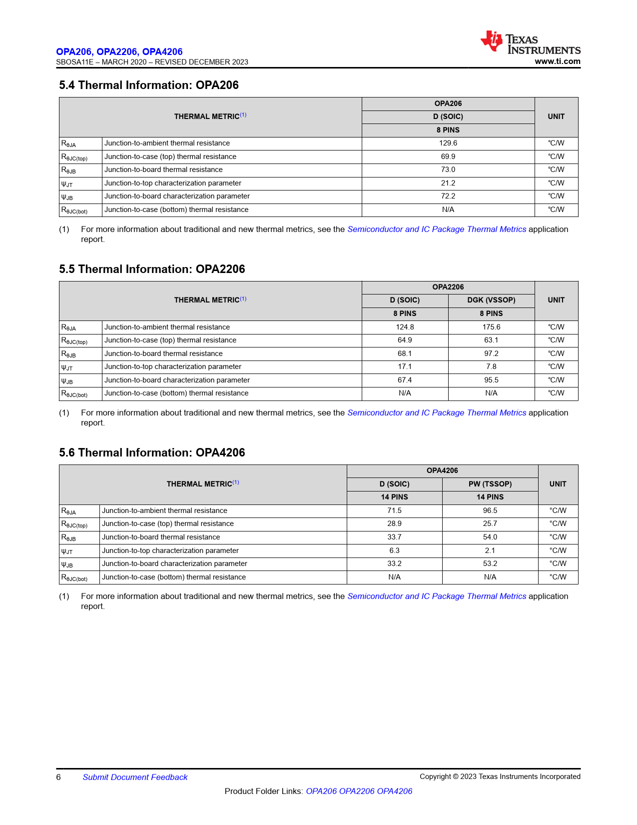 | Pages / Page | 48 / 6 — OPA206, OP. A2206, OP. A4206. www.ti.com. 5.4 Thermal Information: … |