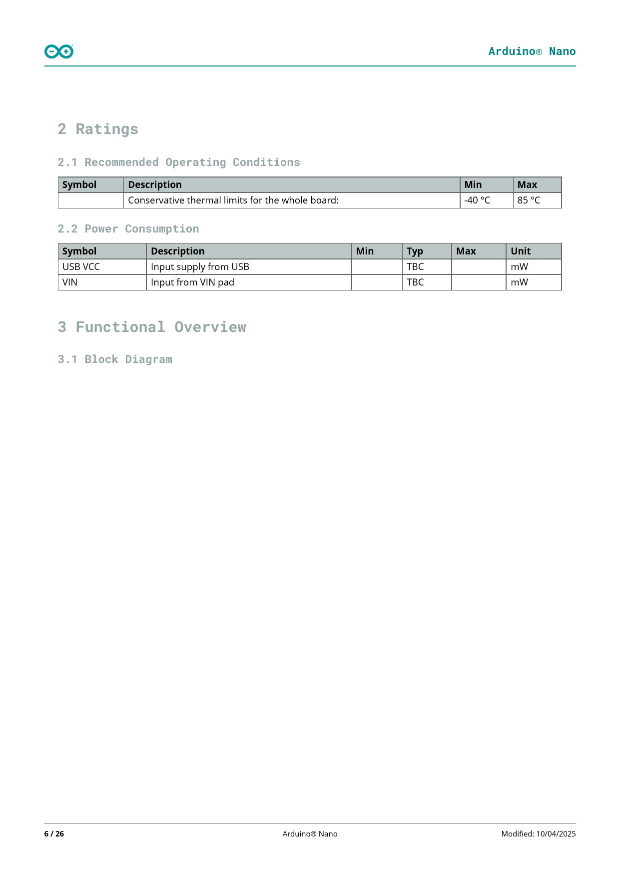 Arduino® Nano. 2 Ratings. 2.1 Recommended Operating Conditions. Symbol. Description. Min. Max. 2.2 Power Consumption. Typ. Unit